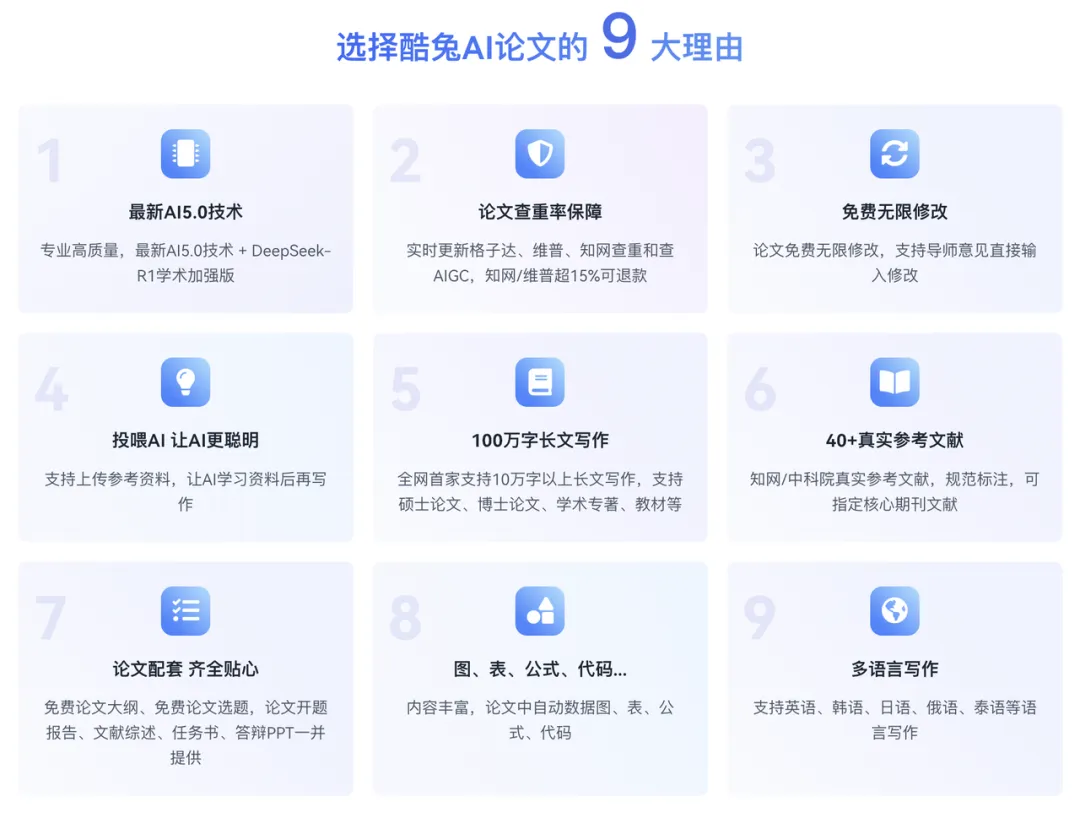 酷兔AI以快速成稿、基础合规为核心。在论文AI生成、AI生成论文与AI写论文过程中,保障内容基础完整、表达通顺,适配AI写课程论文、AI写实习报告、AI写活动论文与AI写职称论文等基础写作场景,满足普通用户的基础论文写作需求。