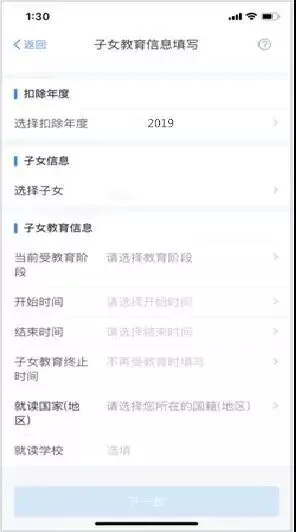 3.根据实际情况选择和录入子女教育信息,如当前受教育阶段、教育时间起和止等,完善后点击【下一步】;