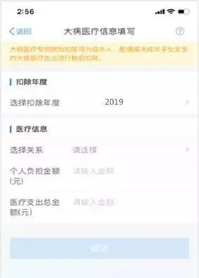 3.选择扣除年度、与纳税人的关系,据实录入个人负担金额以及医疗支出总金额,点击【提交】即可。