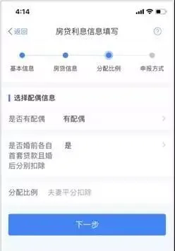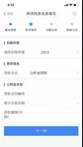3.选择扣除年度以及贷款方式。贷款方式分为公积金贷款、商业贷款、组合贷三种,至少填写其中一项点击【下一步】;