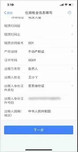 4.出租方类型分为自然人和组织,需要录入对应类型的出租人身份证件信息或出租单位统一社会信用代码(纳税人识别号),点击【下一步】;