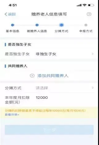 4.选择是否独生子女。独生子女,分配比例为全部由本人扣除;非独生子女,需录入共同赡养人、本年度月扣除额并选择分摊方式(赡养人平均分摊、赡养人约定分摊、被赡养人指定分摊),点击下一步;