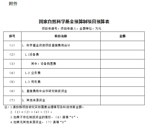 《预算表》填报直接费用金额、直接费用中合作研究转拨资金金额以及其他来源资金金额。各科目均无比例限制,由项目申请人根据项目研究需要,按照有关科目定义、范围和标准等如实编列。