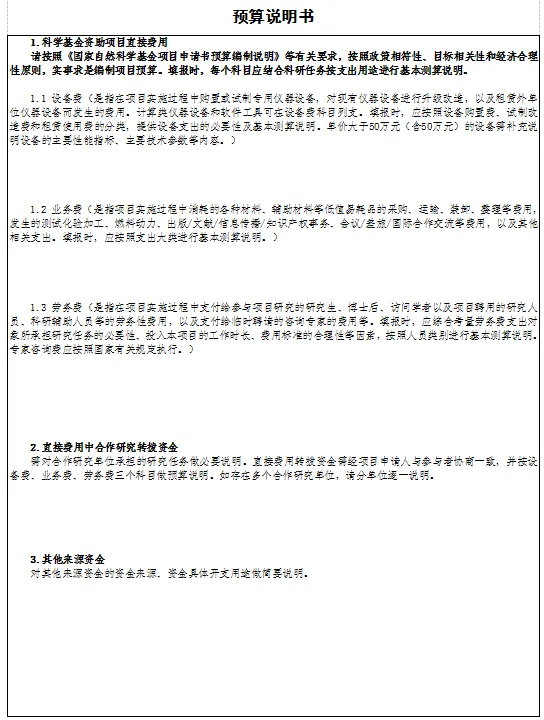 《预算说明书》要对《预算表》中直接费用各科目预算、直接费用中合作研究转拨资金以及其他来源资金进行必要说明。每个科目应结合科研任务按支出用途进行基本测算说明。