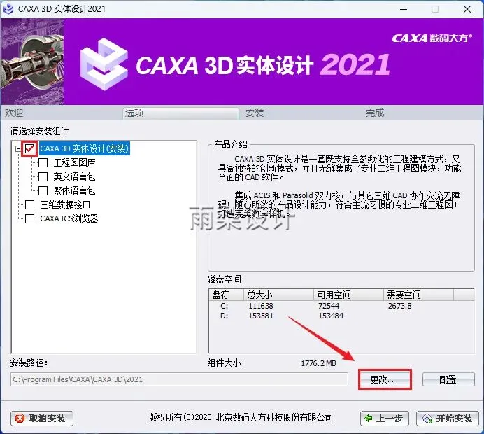 5.勾选【CAXA 3D 实体设计】,点击【更改】