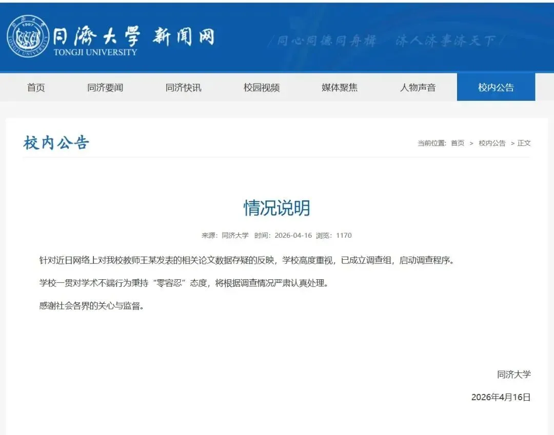同济大学新闻网4月16日发布情况说明:对学术不端“零容忍”,启动调查程序↓↓↓
