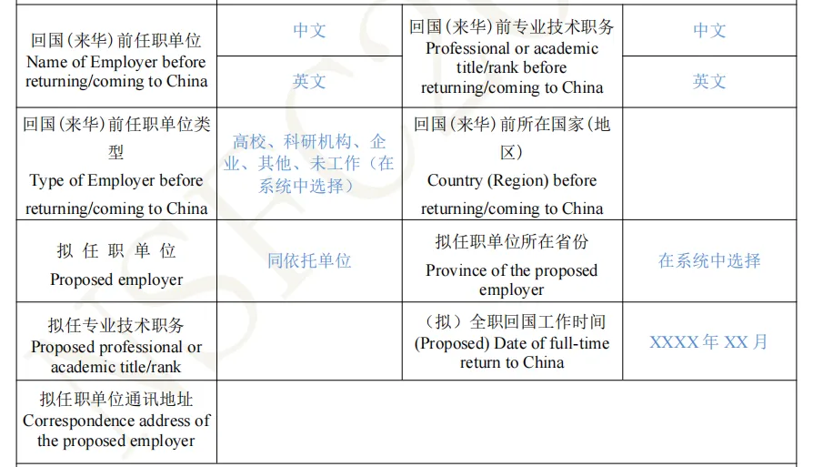 1.字段:出生国家(地区)、回国(来华)前任职单位类型及所在国家(地区)、拟任职单位所在省份与通讯地址、(拟)全职回国工作时间。