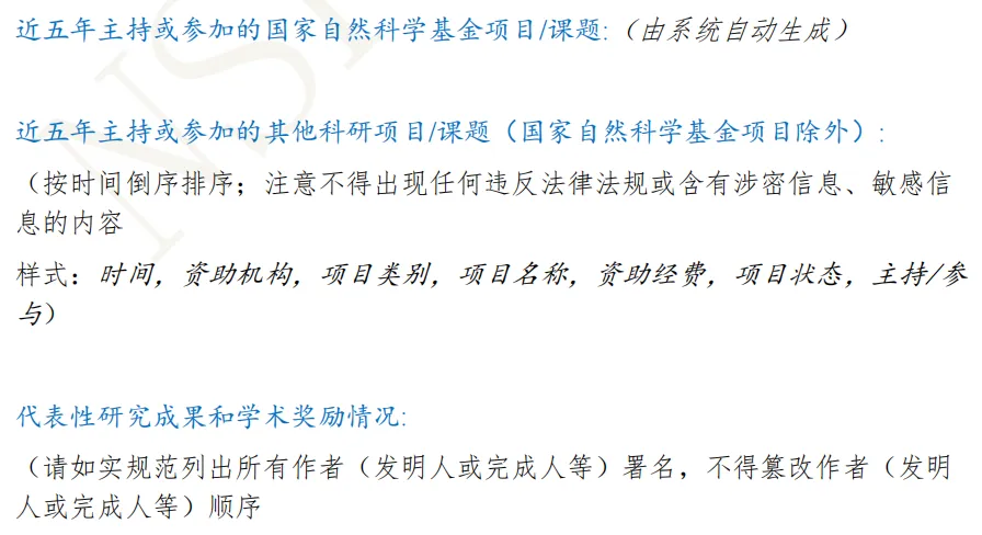 3.科研项目格式标准化:近五年主持或参与的非国家自然科学基金项目,需按统一格式填写:时间、资助机构、项目类别、项目名称、资助经费、项目状态、主持/参与。