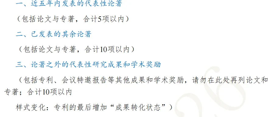 贡献更明确:代表性成果须说明“本人贡献”,专利新增“成果转化状态”;