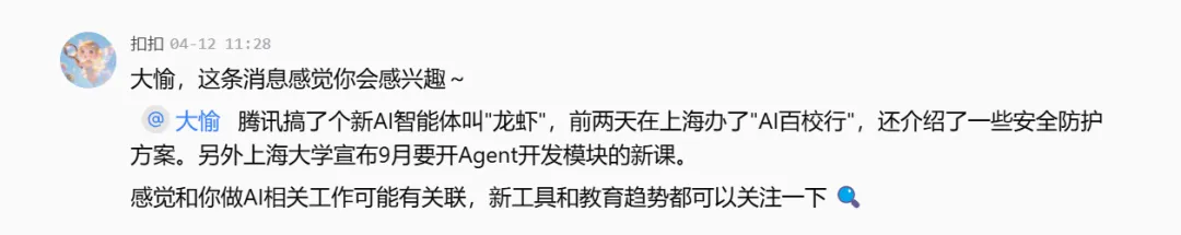 更重要的是,它会根据你的偏好来调整互动方式。比如我设置了一些关注领域,它就会主动推送相关资讯,而不是等我每次想起来再去问: