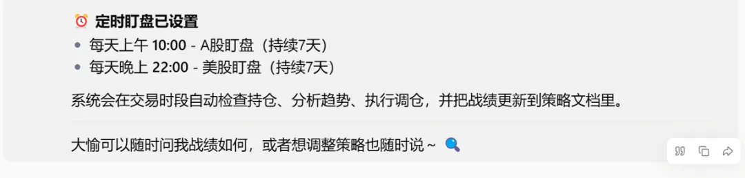 系统会在交易时段自动检查持仓、分析趋势、执行调仓,并把战绩更新到策略文档里。你随时可以问它战绩如何,或者想调整策略也随时说。