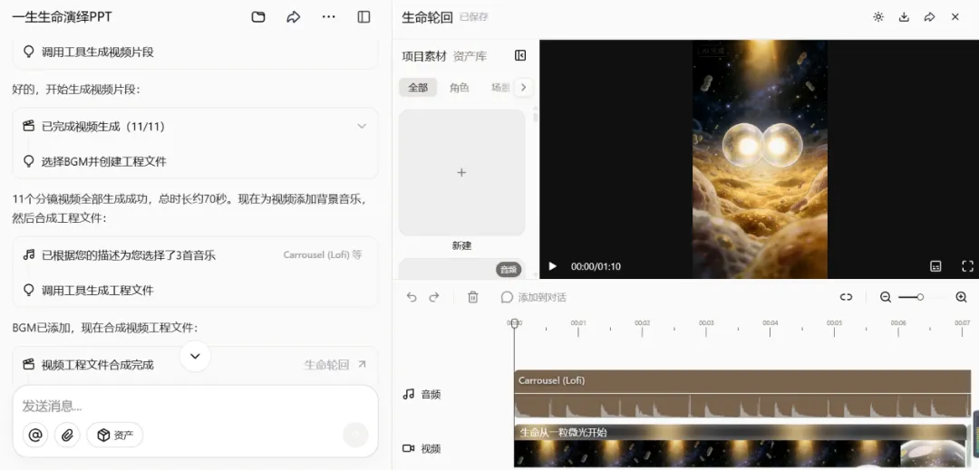 我随便试了一下,体验感挺好的。实测从输入想法到拿到70秒的视频片段,前后不到十五分钟。