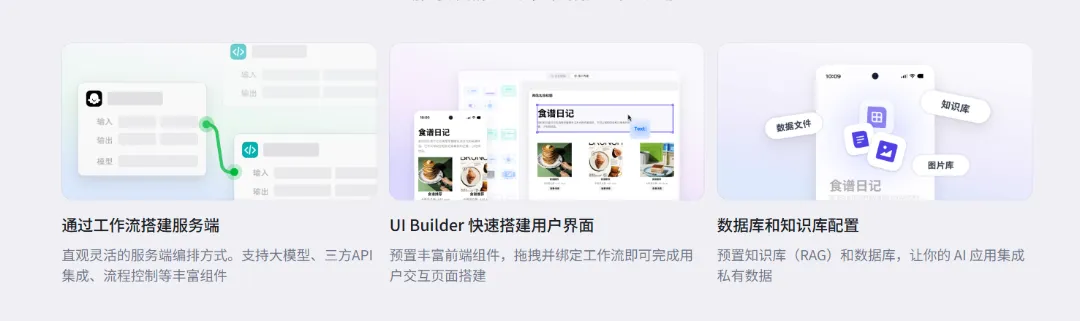拖拽并绑定工作流即可完成用户交互页面搭建。同时支持预置知识库和数据库配置,让AI应用能够集成私有数据。