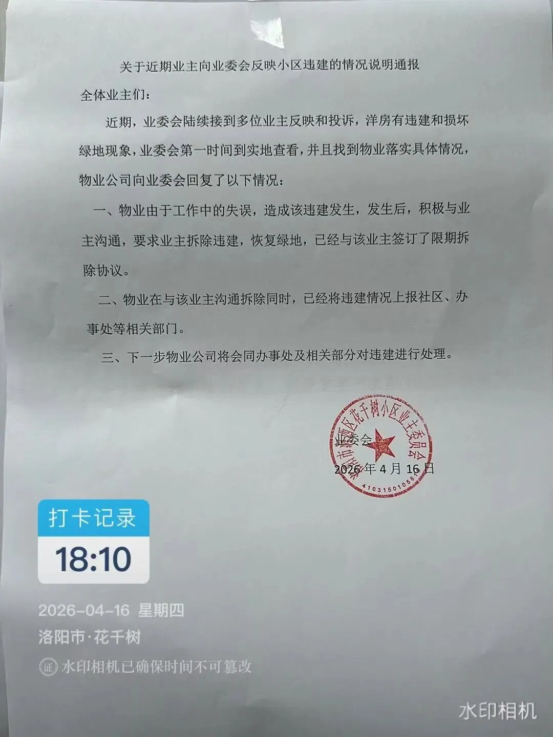 近期,业委会陆续接到多位业主反映和投诉,洋房有违建和损坏绿地现象,业委会第一时间到实地查看,并且找到物业落实具体情况,物业公司向业委会回复了以下情况: