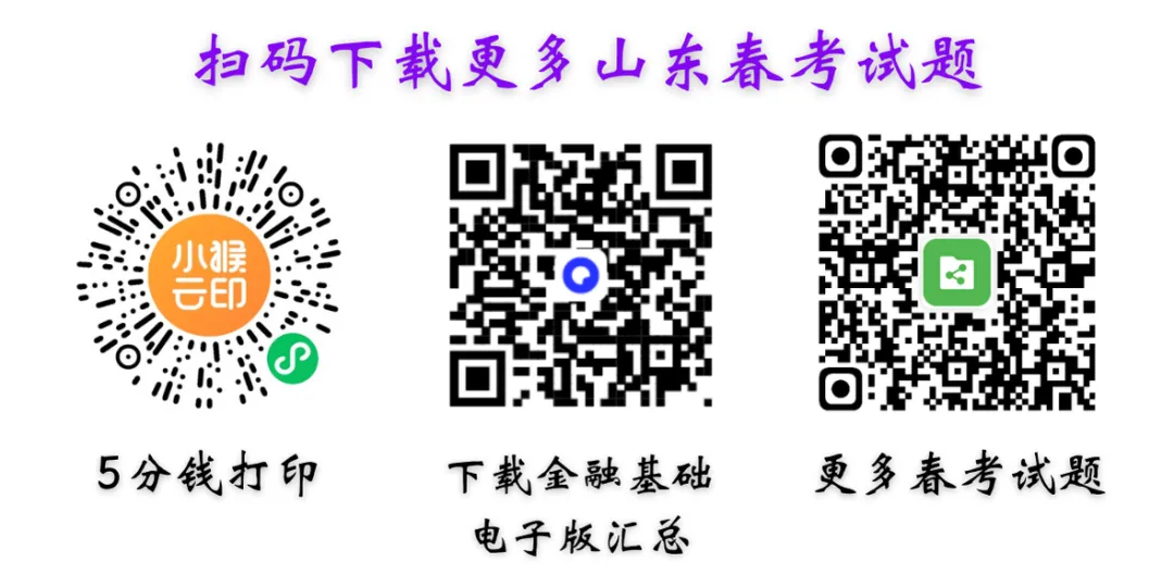 山东春考财税《金融基础》知识点汇总(可打印) 扫码添加老师领取电子版及免费资料 ▲ 扫描二维码下载试题和答案 春考QQ交流群 【有财税试题】 山东春考交流总群:926086856 25年单招、综评交流群:526746858 春考财税专业专属交流群:945592440