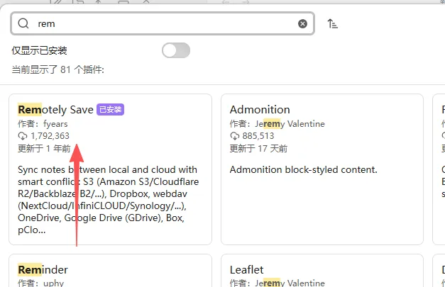 打开Obsidian → 设置 → 第三方插件关闭安全模式 → 浏览 → 搜索"Remotely Save"安装并启用插件(因外网原因有时安装失败,或者网页刷新不出多卸载、尝试几遍即可)