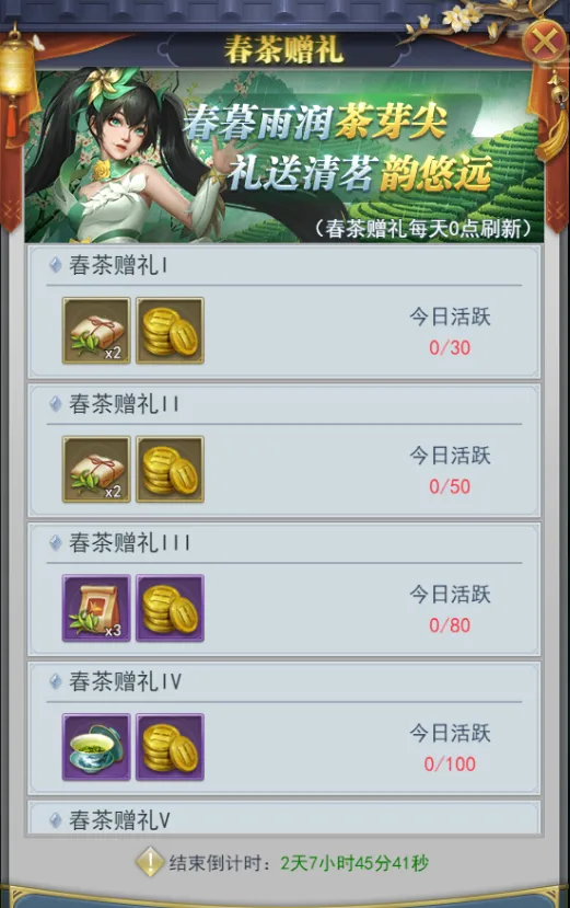 春茶赠礼每天0点重置领取进度。