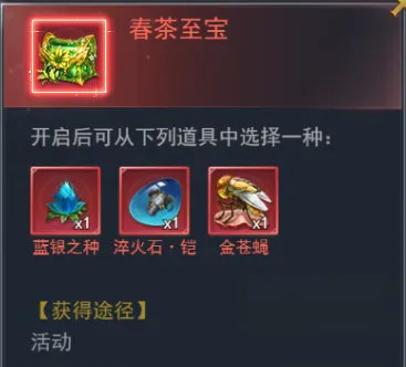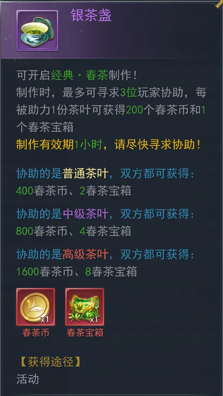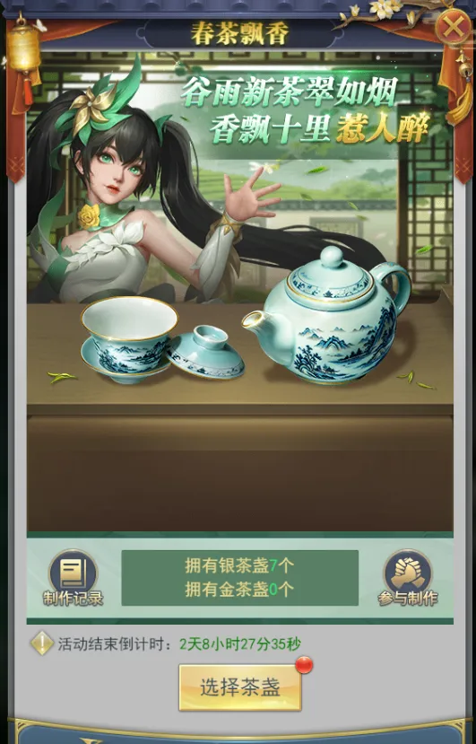 使用银茶盏或金茶盏分别制作经典·春茶、臻藏·春茶,获得春茶币、春茶宝箱奖励
