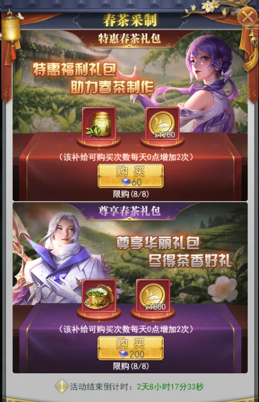 活动期间购买礼包,获取高级茶叶、大量春茶币、金茶盏,助力制作春茶!