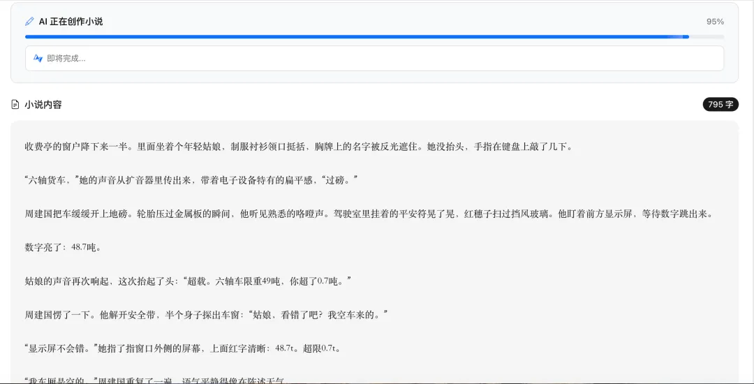 比如当下番茄特别火的 “收费站说我超重,可我是空车” 这种类似的,只要你把故事的主要情节说完整了,AI 就能给编出一篇完整的短篇。