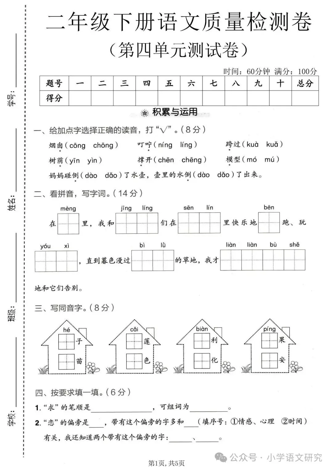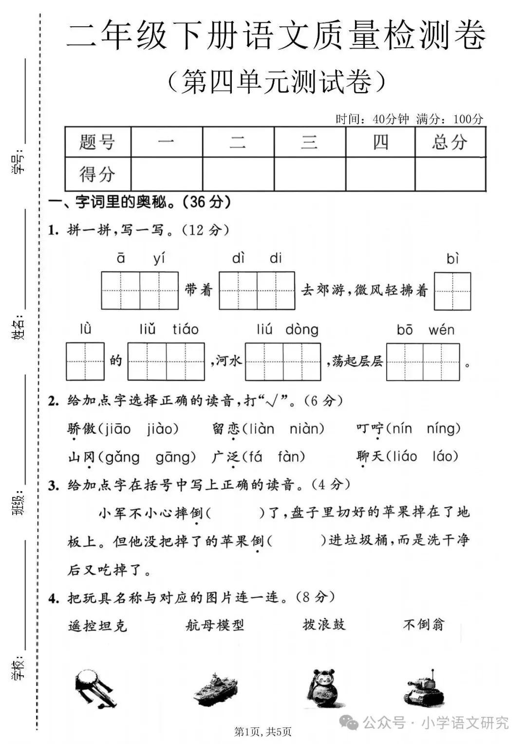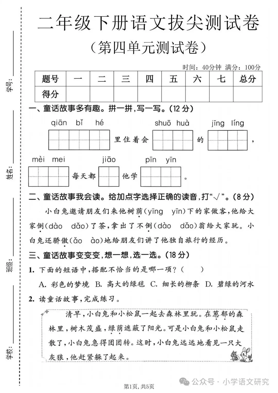 二年级语文下册《第四单元检测卷》3套丨可下载