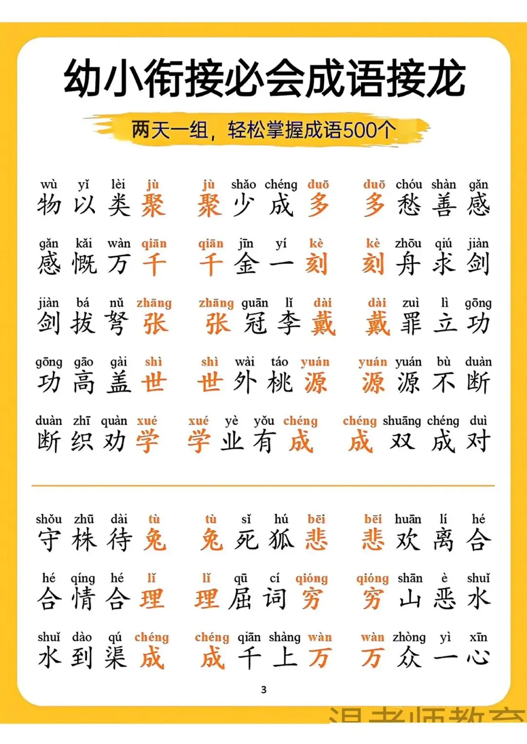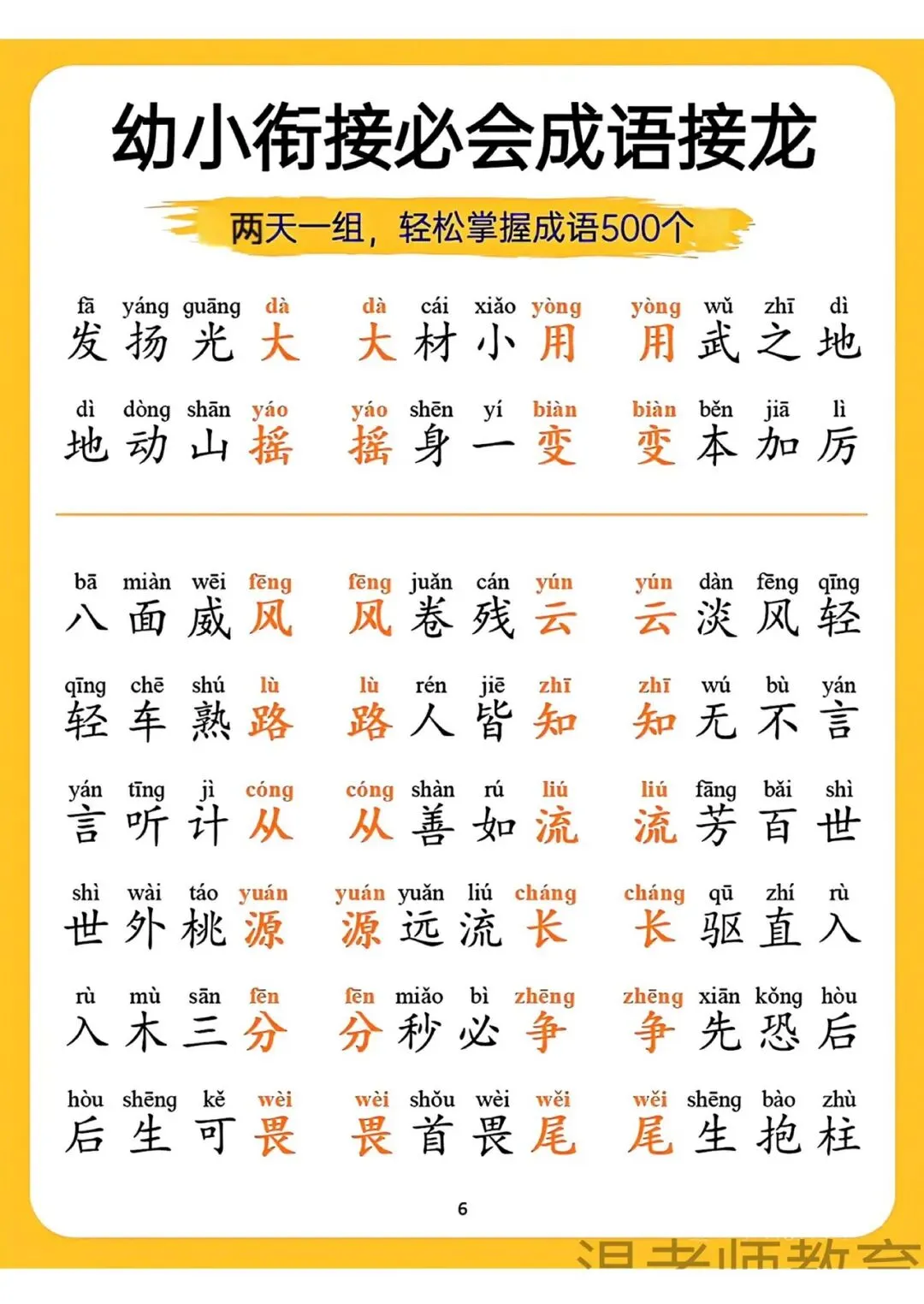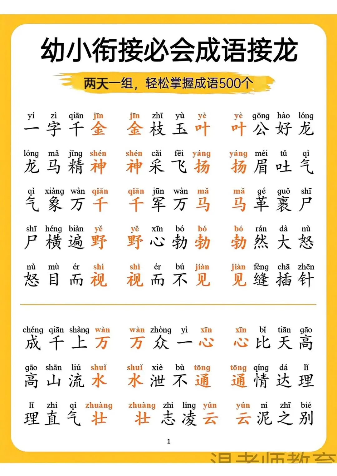 幼小衔接必会成语接龙来啦!可打印电子版,两天一组,轻松掌握500个成语,带拼音标注,帮孩子积累词汇、提升语文素养,为小学学习打好基础,需要的家长快给孩子安排上~