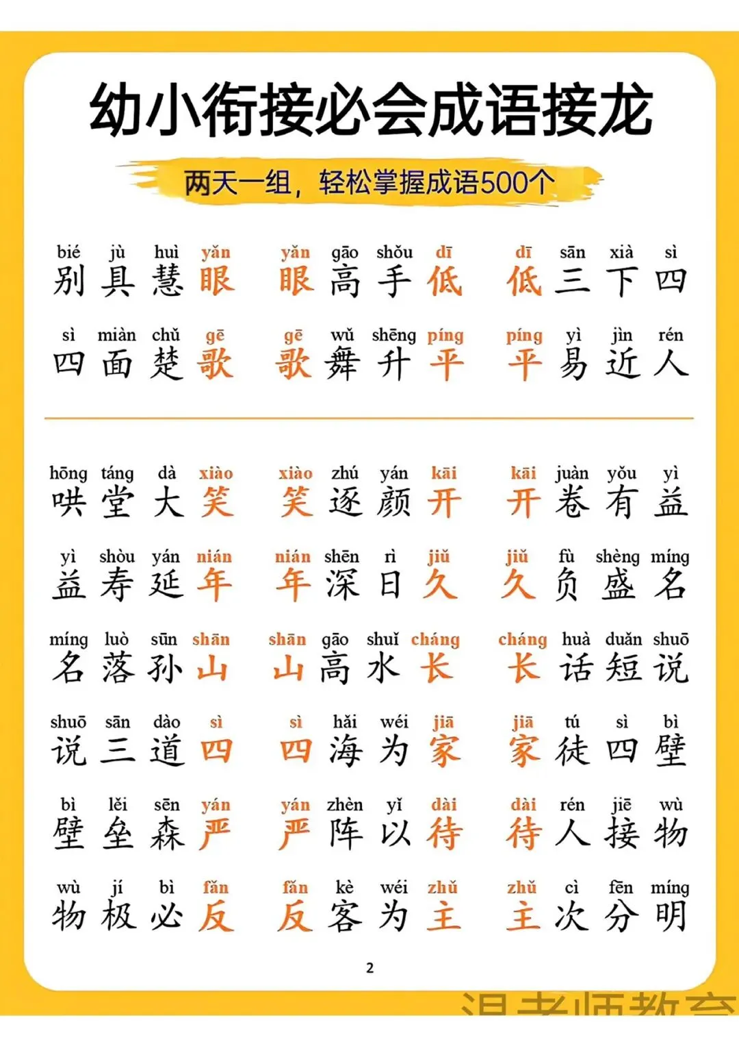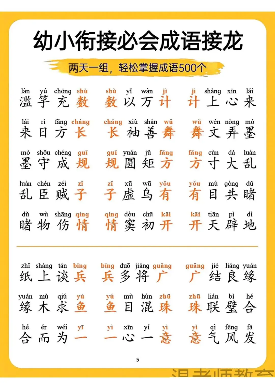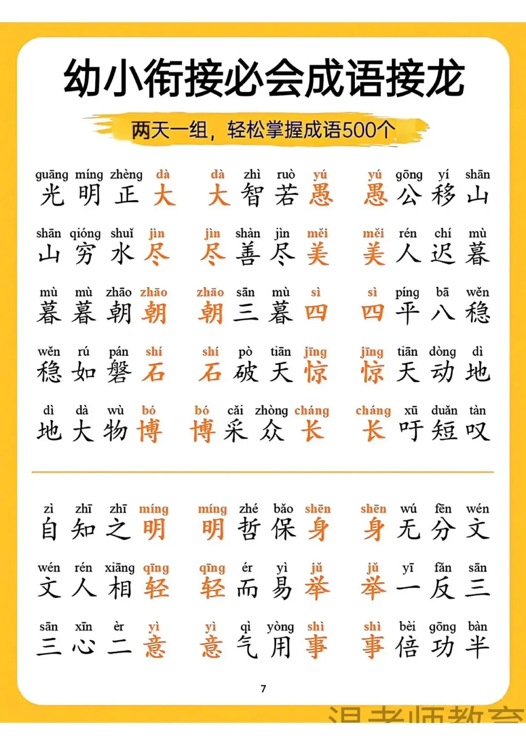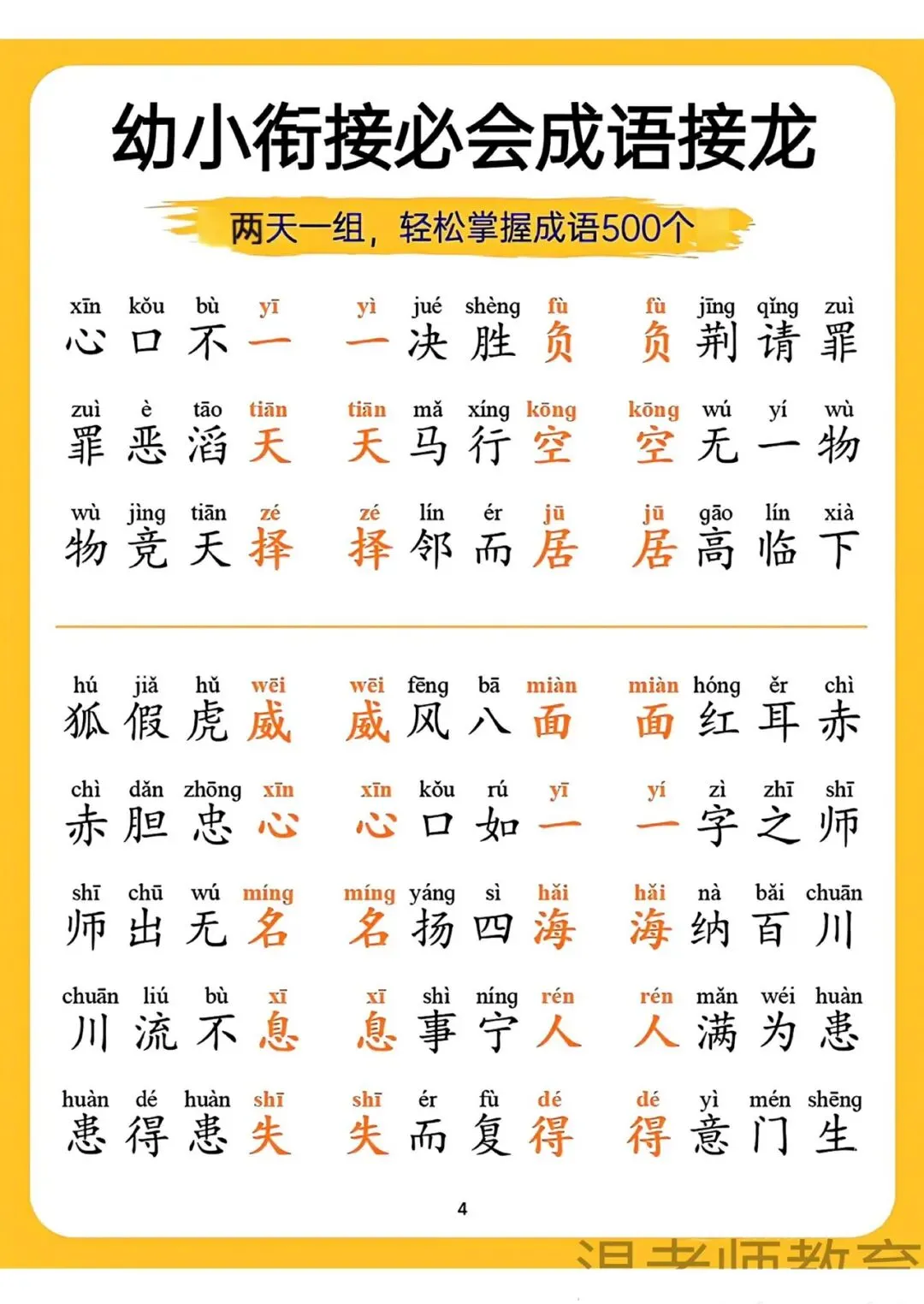幼小衔接必会成语接龙来啦!可打印电子版,两天一组,轻松掌握500个成语,带拼音标注,帮孩子积累词汇、提升语文素养,为小学学习打好基础,需要的家长快给孩子安排上~