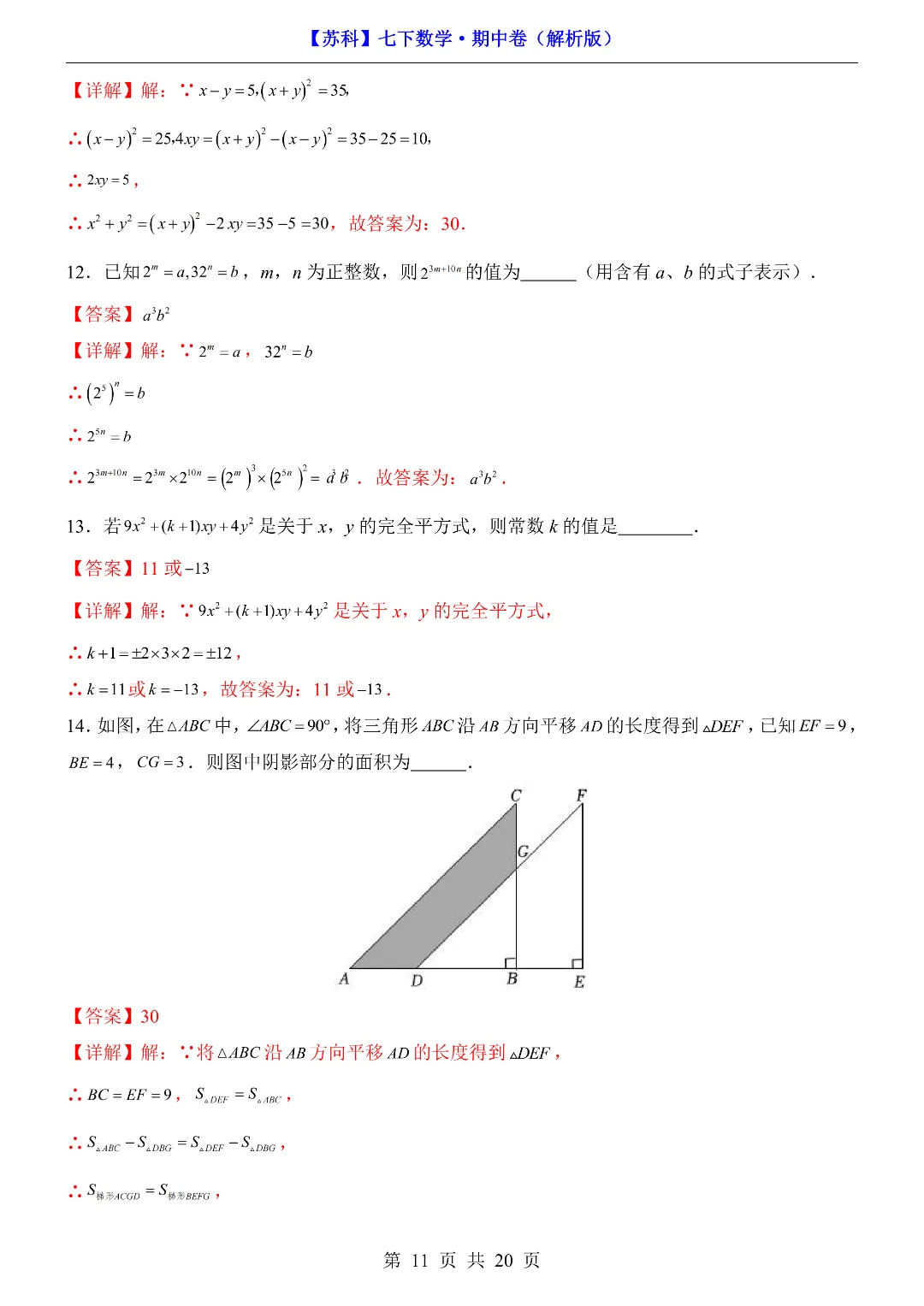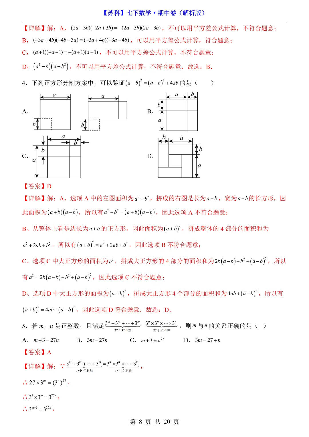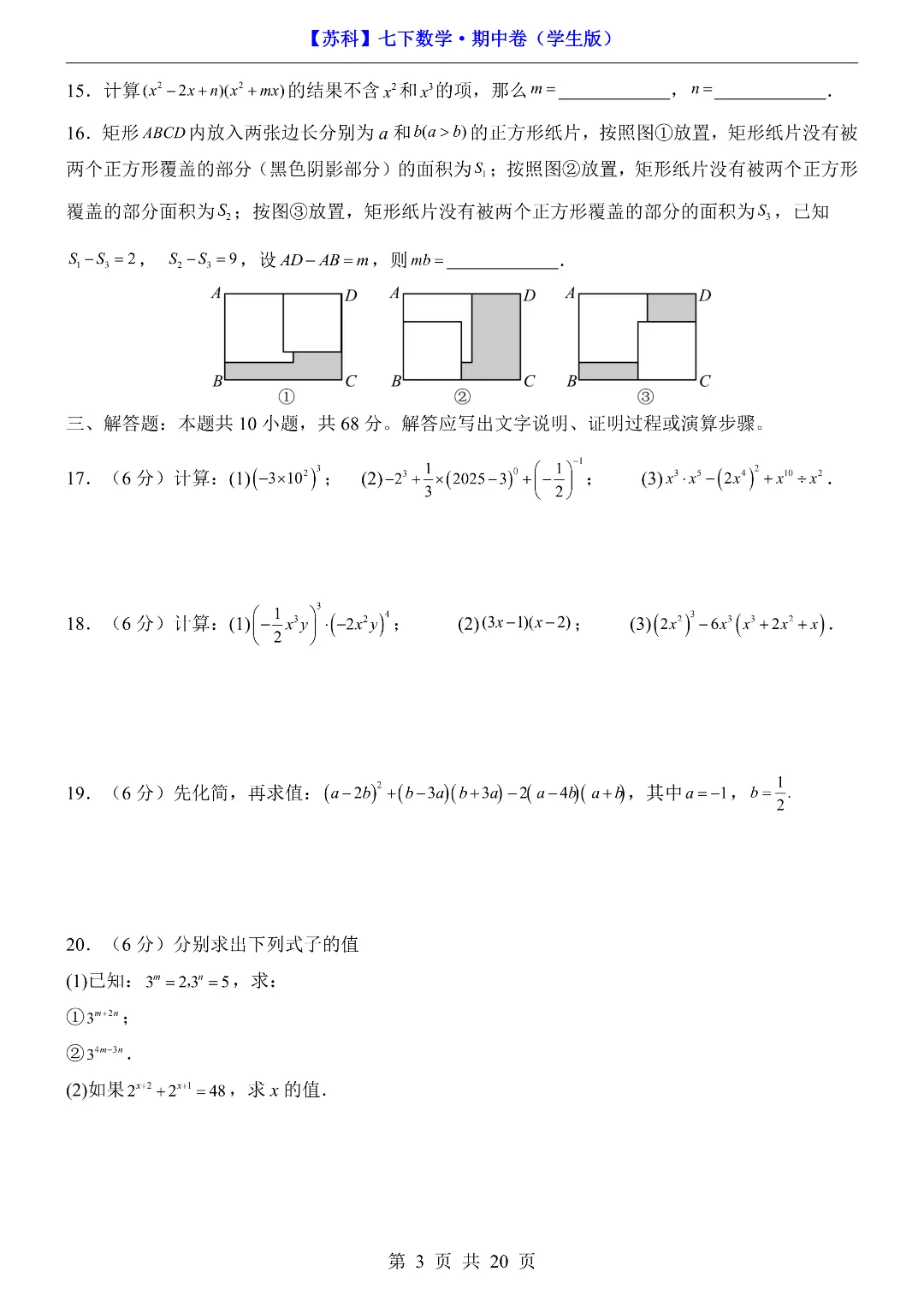 今天给家长们分享的是:26年春新七年级下册苏科版数学《期中考试测试卷》附答案解析‖高清电子版可打印