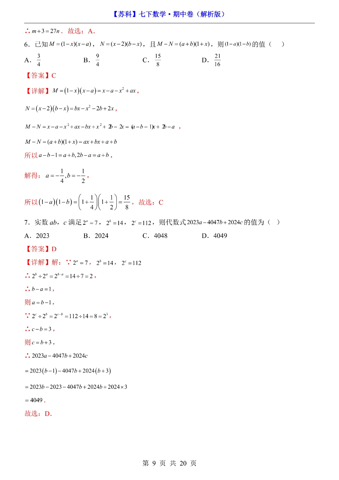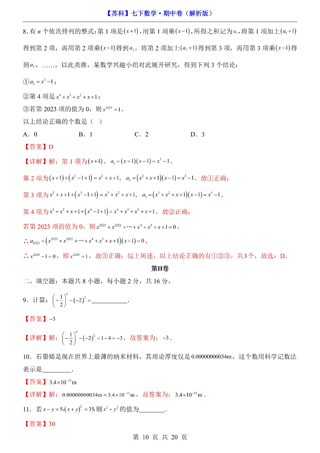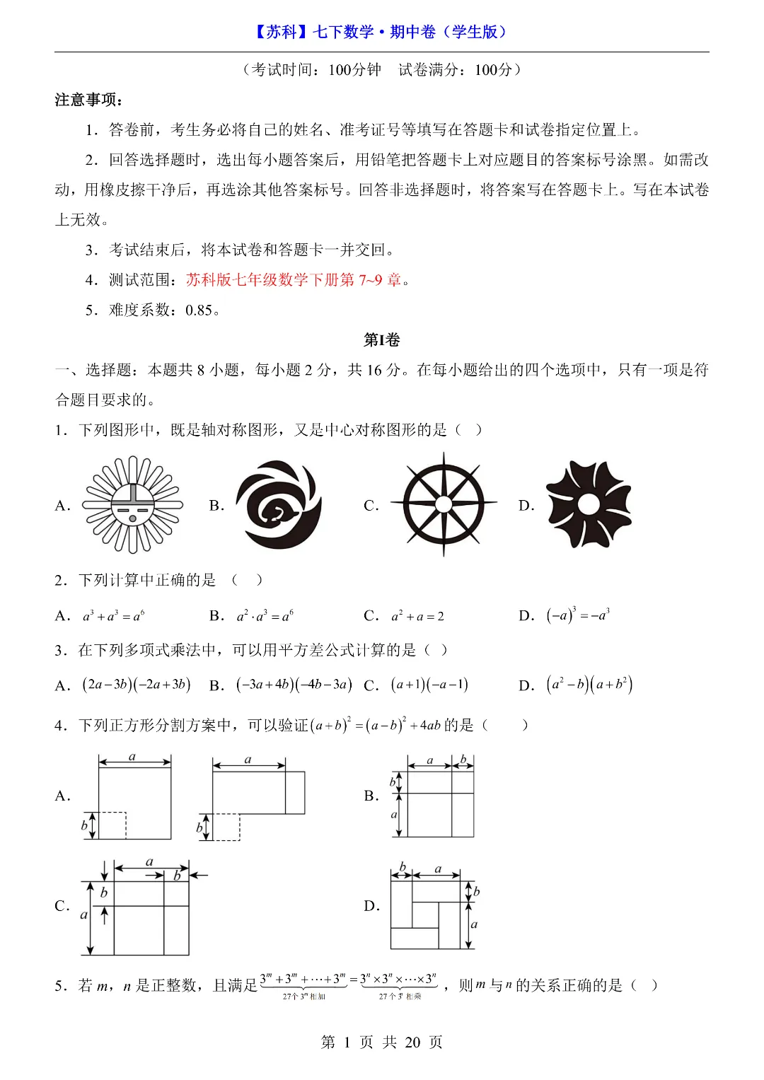 今天给家长们分享的是:26年春新七年级下册苏科版数学《期中考试测试卷》附答案解析‖高清电子版可打印