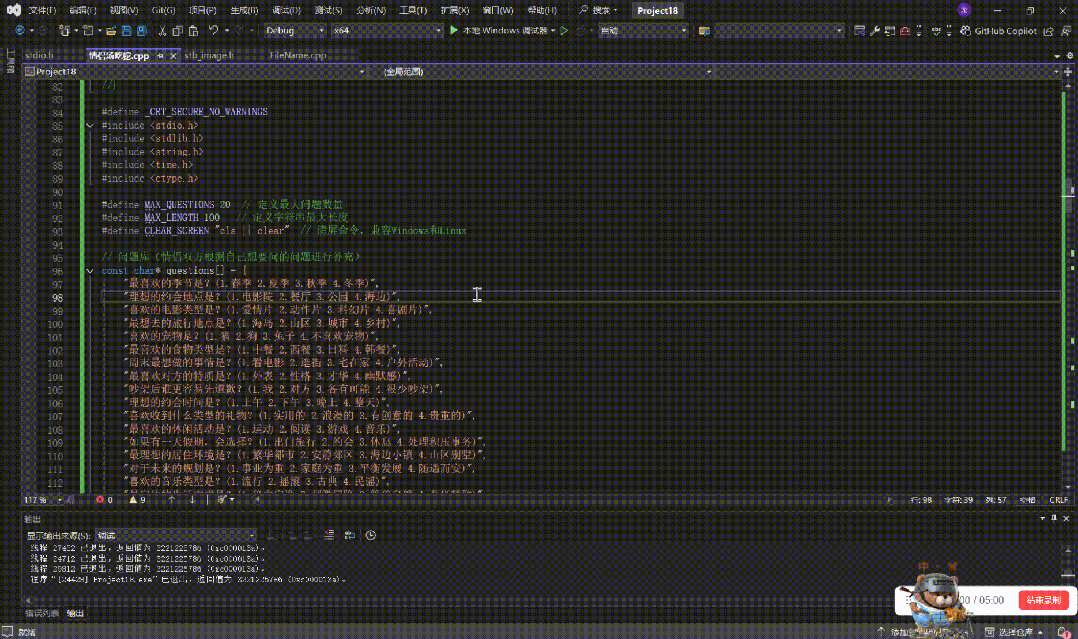 1. 程序功能:程序启动后,会按照用户设定的问题库,进行为期5轮的默契问答考验。单轮为一个问题,两名玩家互相猜对方的问答,考验情侣间的默契度。