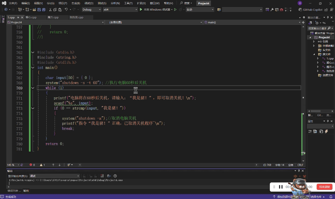 1. 使用须知:程序启动会启动60秒后自动关机,如要取消需输入对应提示词(可自定义),则会关闭定时关机程序,如果输入不是对应的提示词,则会一直循环输入,直至60秒后自动关机。