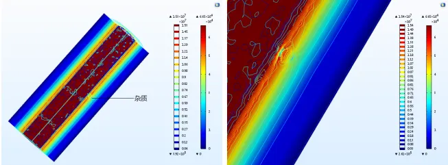 图 3. 左:内含杂质的电缆仿真结果显示电势分布图及电场模等值线。右:电场的局部放大图。