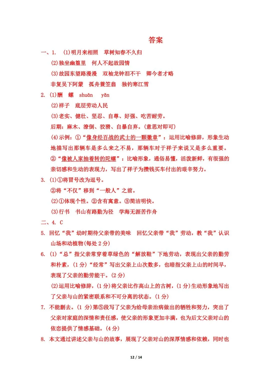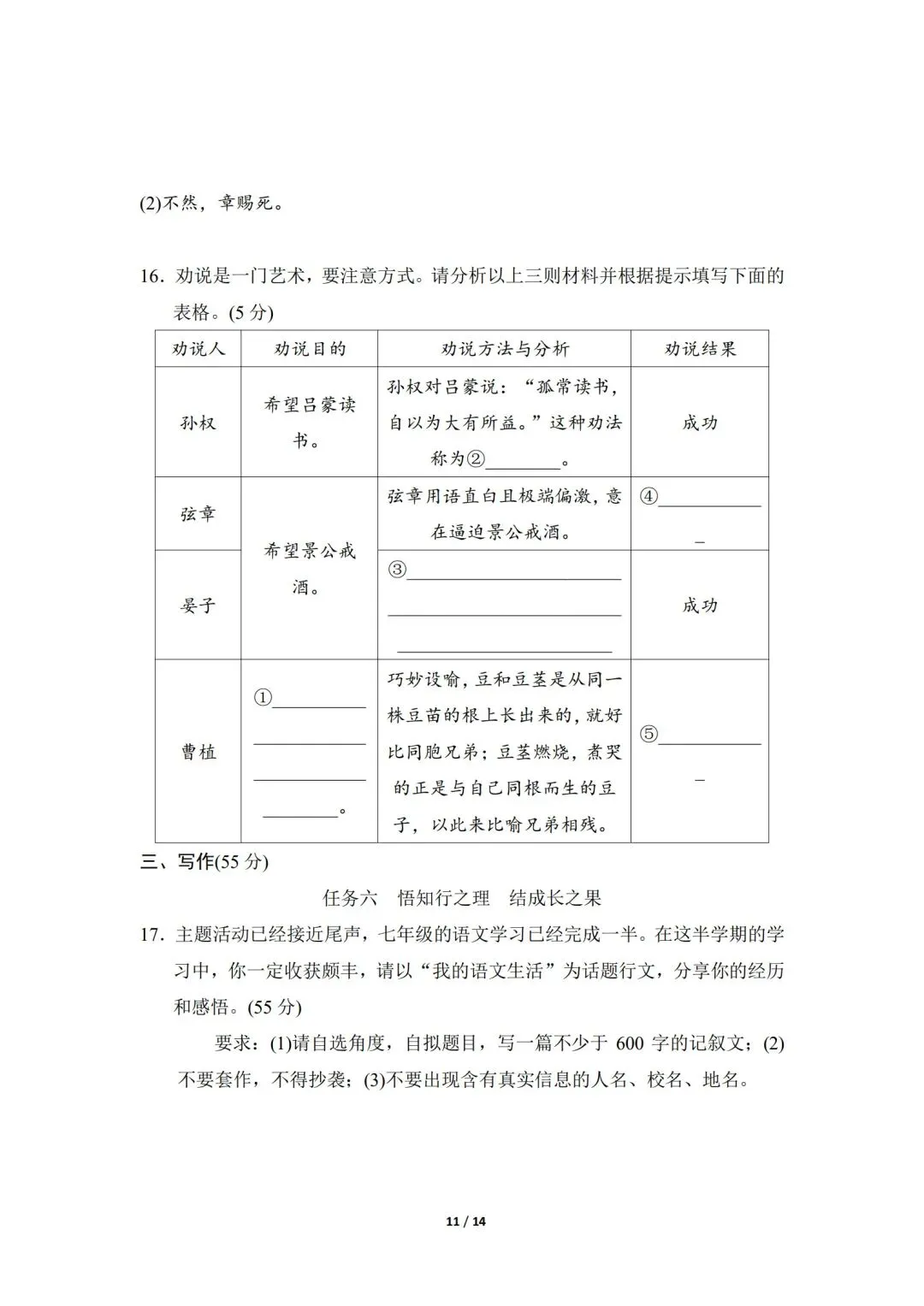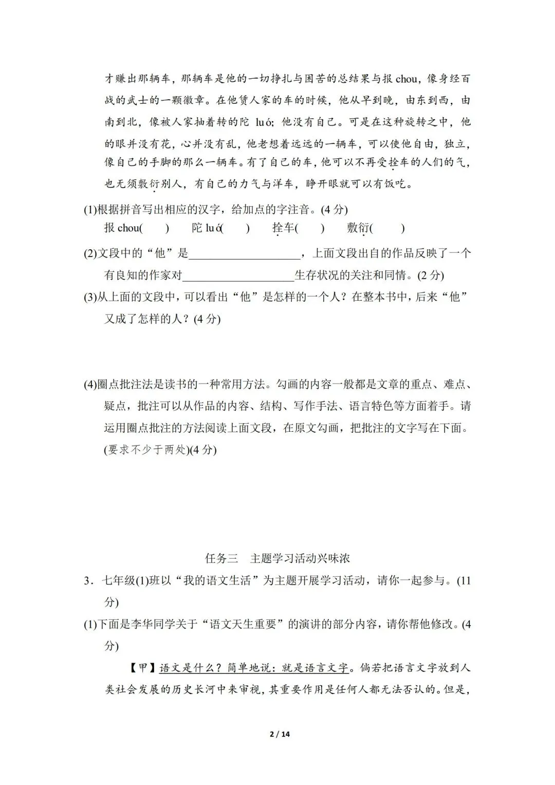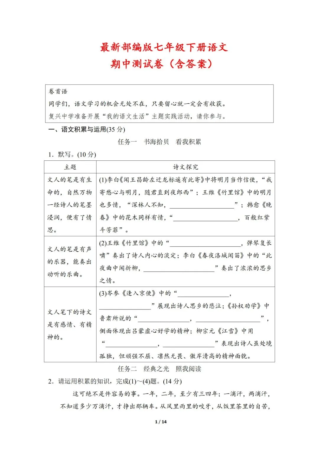 七年级下册《语文期中测试卷+答案》|完整电子版可打印
