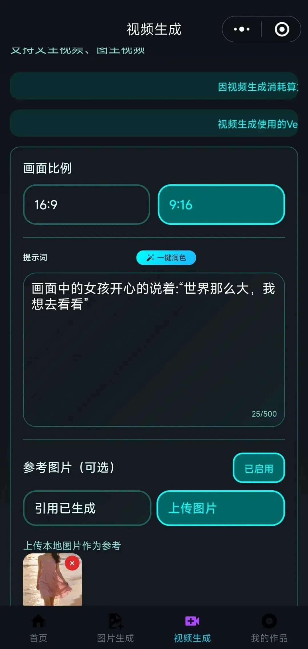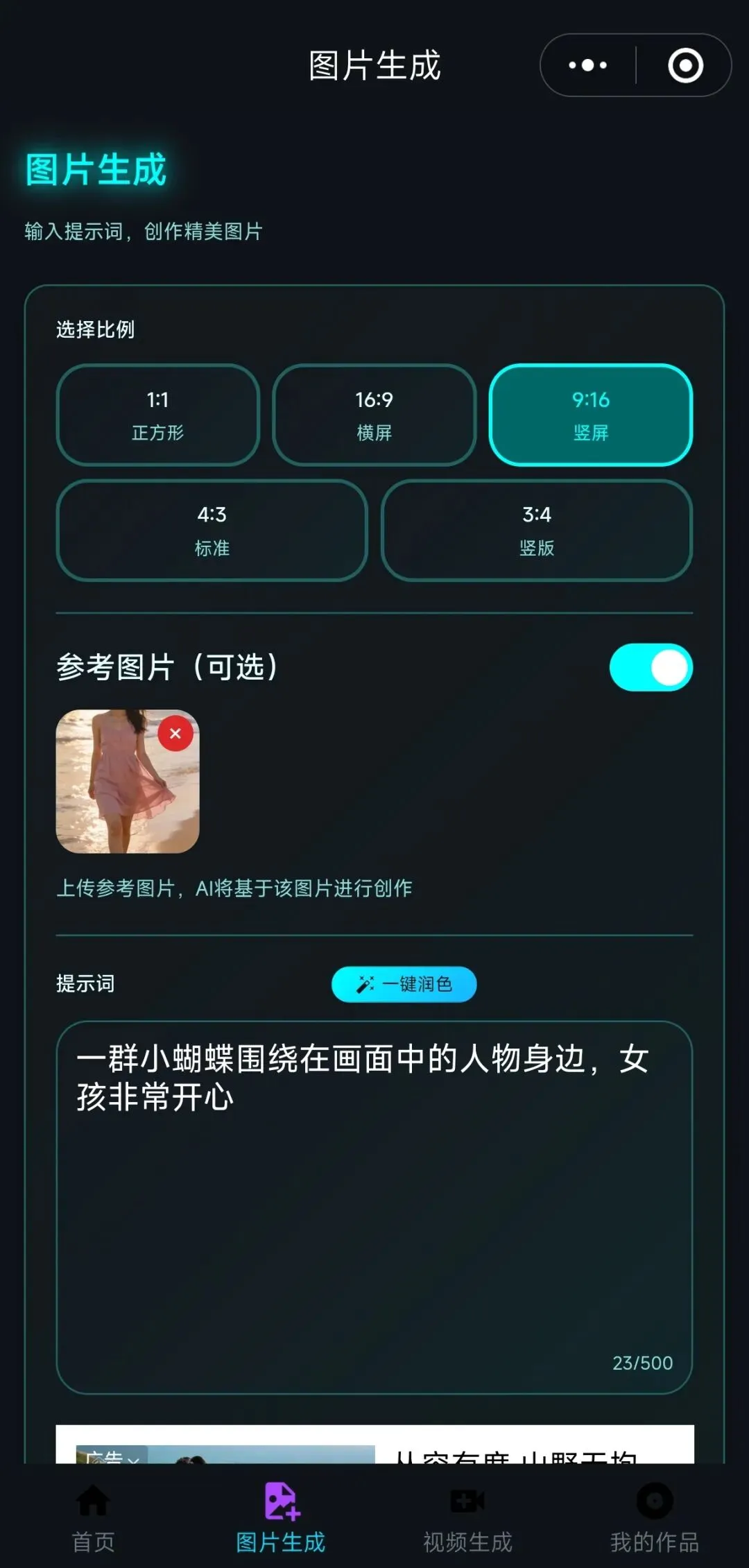 参考图生成:上传图片(可以是真人照片)+ 输入提示词