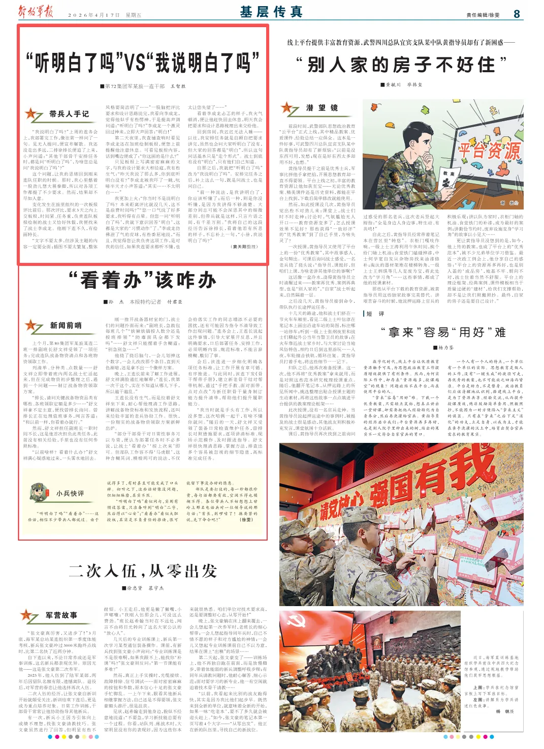 “前一种说法,是我讲明白了,你应该听懂了;而后一种,则是你没听懂,是因为我讲得不够清楚。大部分同志可能不会深思其中的细微差别,但带兵就是这样,只言片语之间,有千差万别。”我将自己的这段经历告诉徐排长,看着他若有所思的样子,不忘补上一句,“小徐,我说明白了吗?”