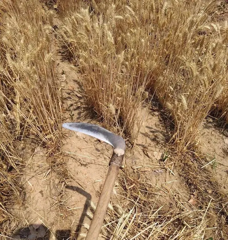 铁头弯弯的那把,叫镰刀,麦收多辣,你知道的都懂,一到夏天顶着太阳下地割麦,左手一搂,右手一割,手指头全是汗勾泥,干一天人都弯成虾,小时候一屋人围着麦场子割得热火朝天,最怕不留神一镰刀下去剁着自个手,阿爷那年教我怎么握刀背,叮嘱再叮嘱,现在地里见镰刀的少了,小田旮旯偶尔才混个脸熟。