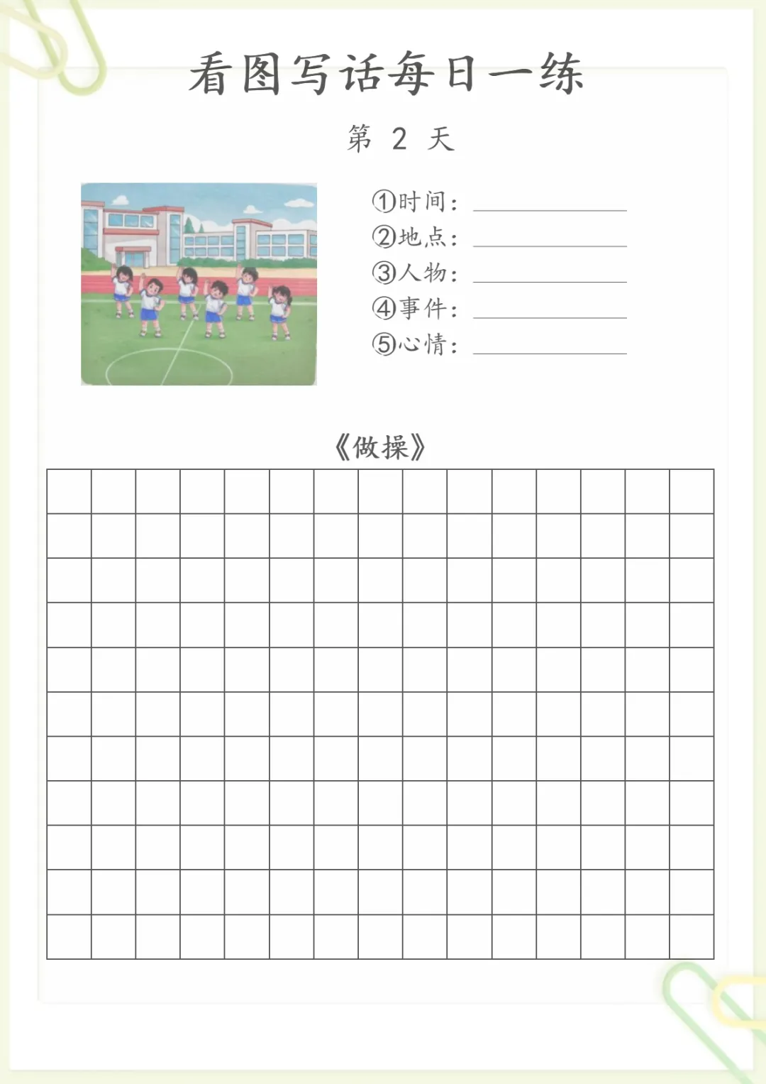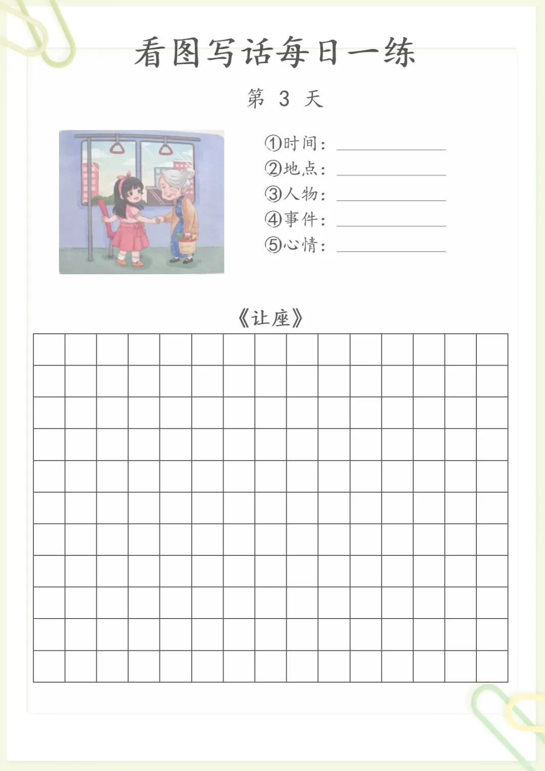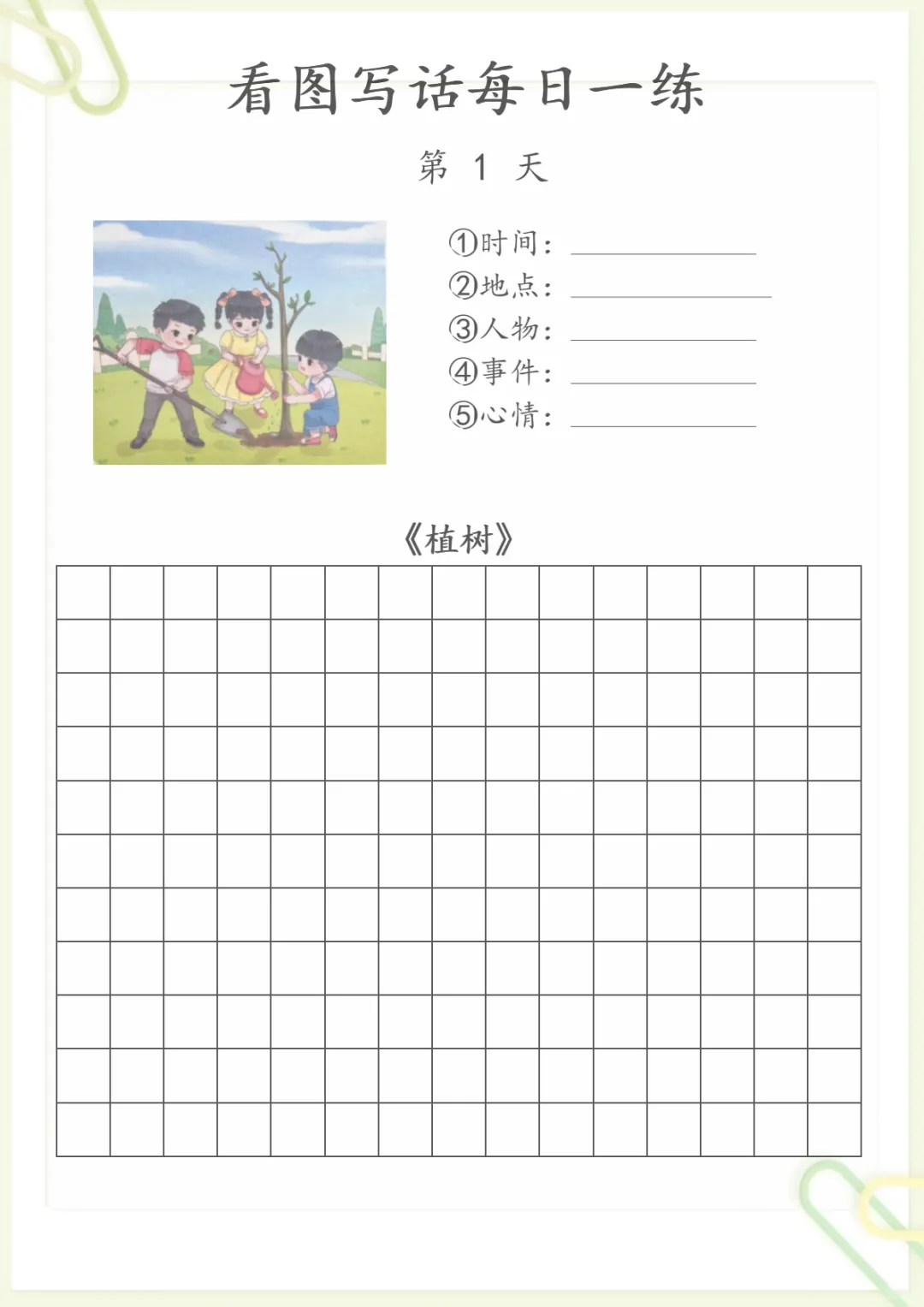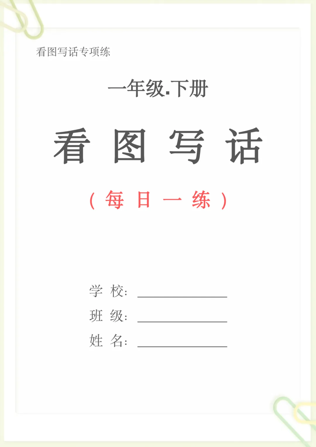 【看图写话每日一练】一下语文,共29页,电子版可下载可打印,这份一年级语文专项练习资料围绕看图观察、语言表达、句子组织和写话训练等内容展开,帮助孩子在日常练习中逐步提升观察能力、表达能力和基础写作能力,更好衔接课内学习与课后巩固。需要的家长可以及时下载打印出来,让孩子每天练一练,积累表达、打好语文基础。