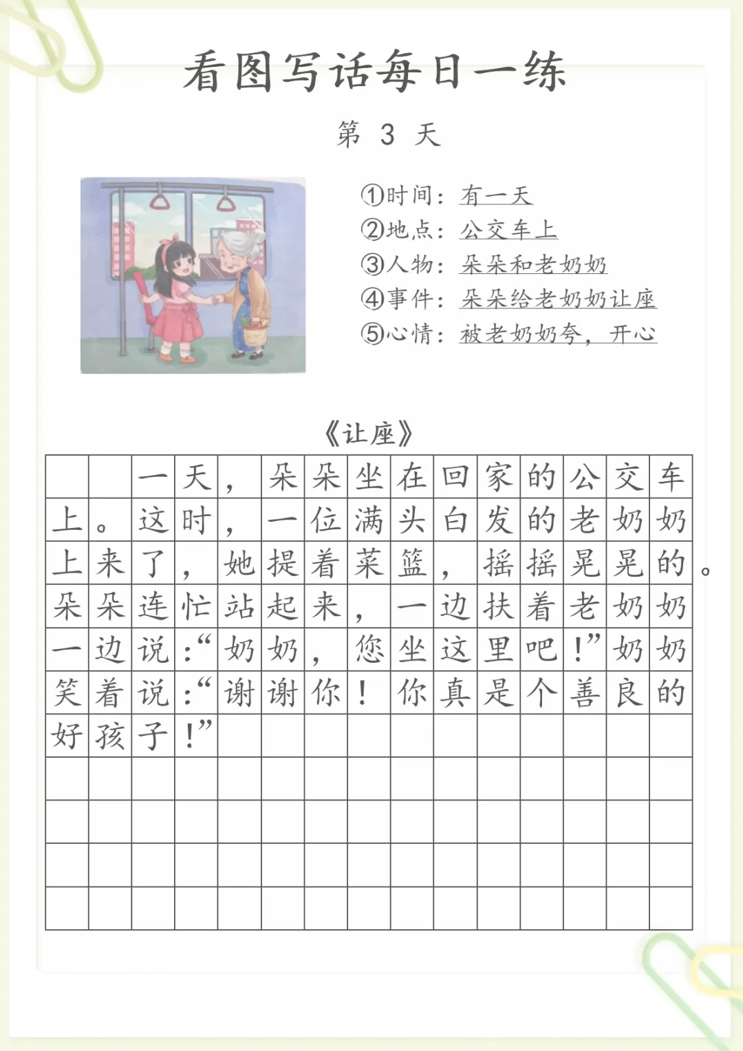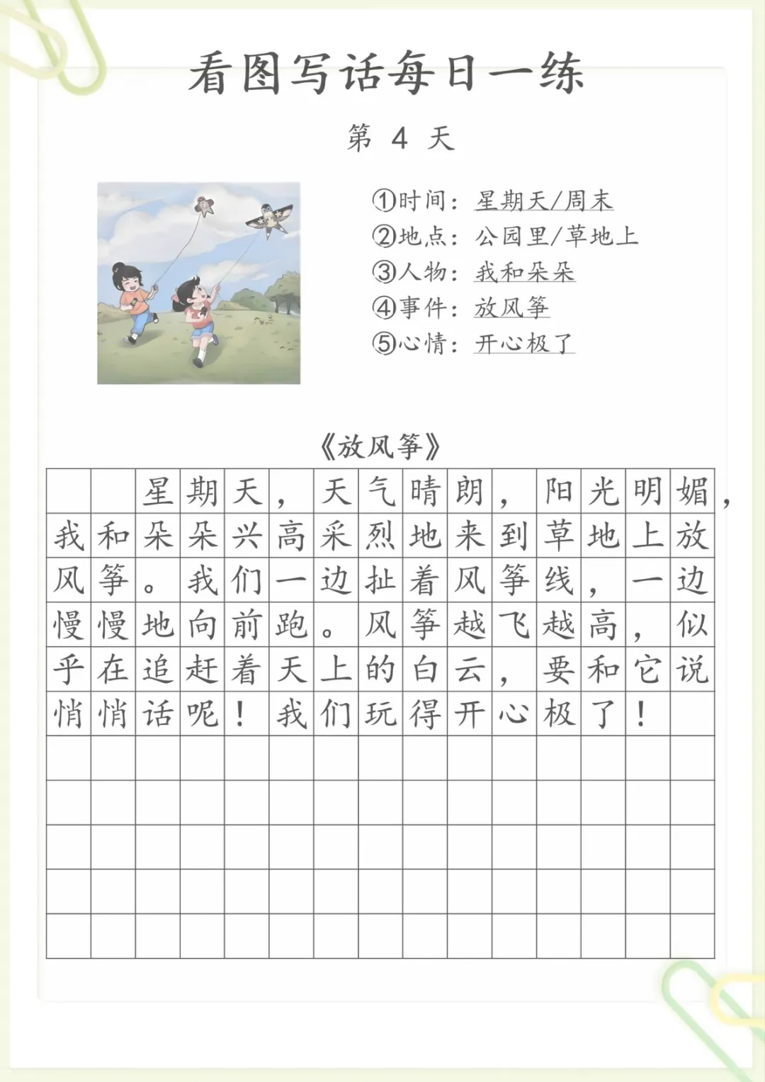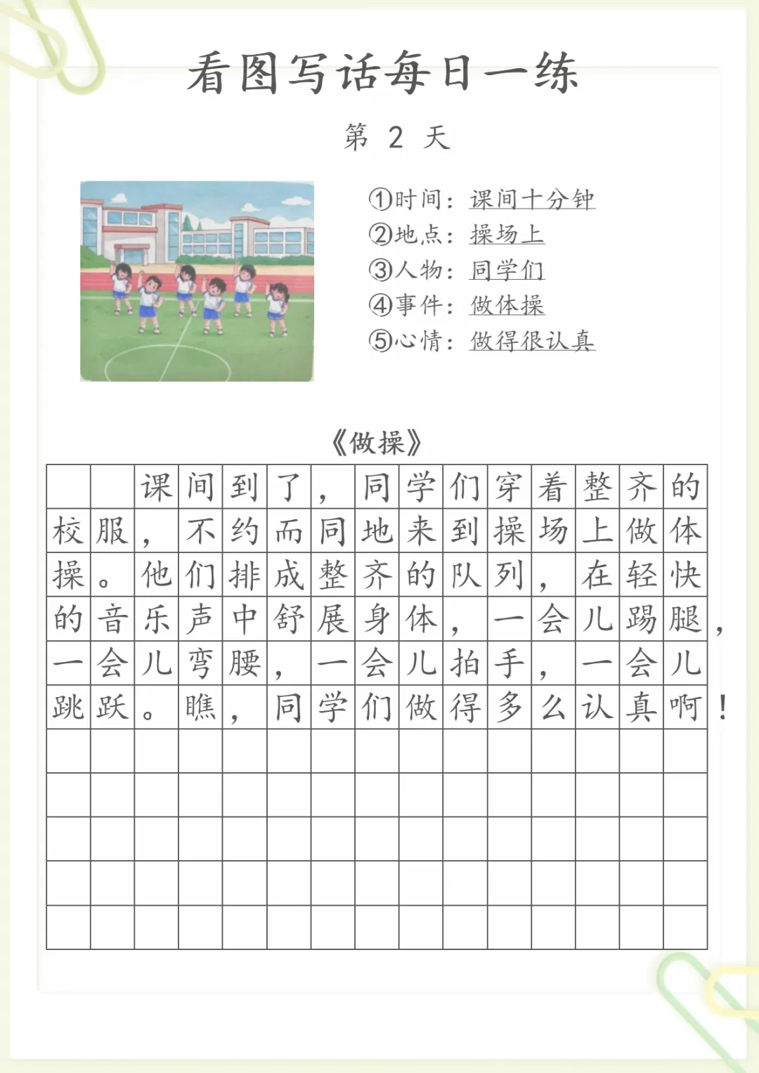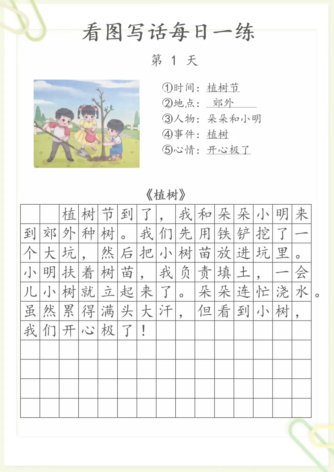 【看图写话每日一练】一下语文,共29页,电子版可下载可打印,这份一年级语文专项练习资料围绕看图观察、语言表达、句子组织和写话训练等内容展开,帮助孩子在日常练习中逐步提升观察能力、表达能力和基础写作能力,更好衔接课内学习与课后巩固。需要的家长可以及时下载打印出来,让孩子每天练一练,积累表达、打好语文基础。