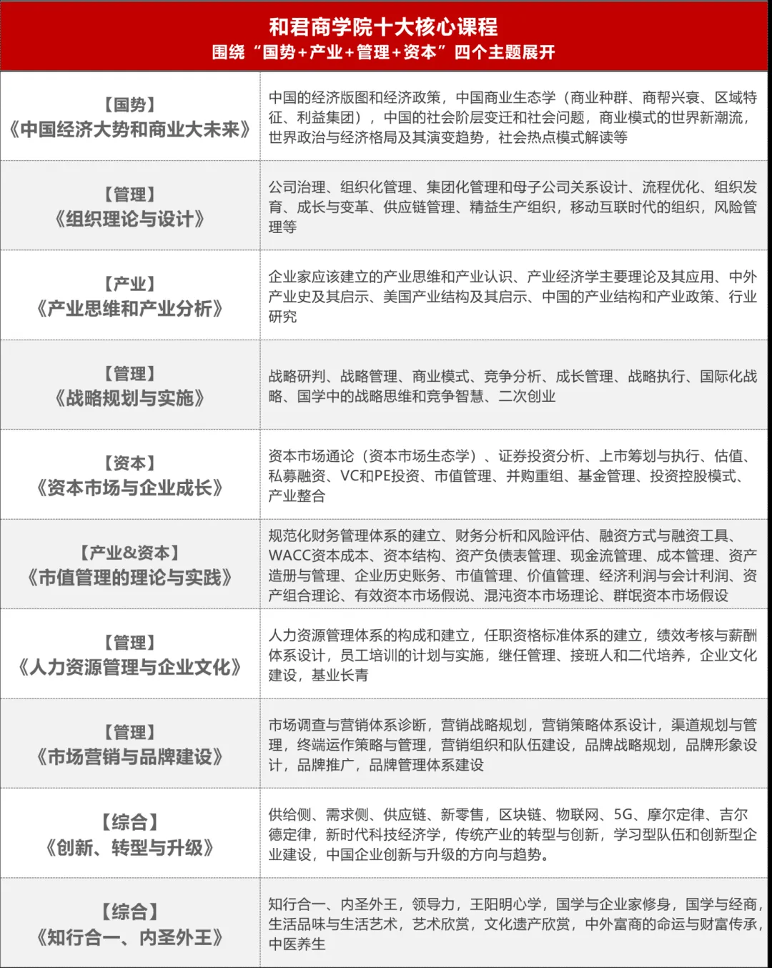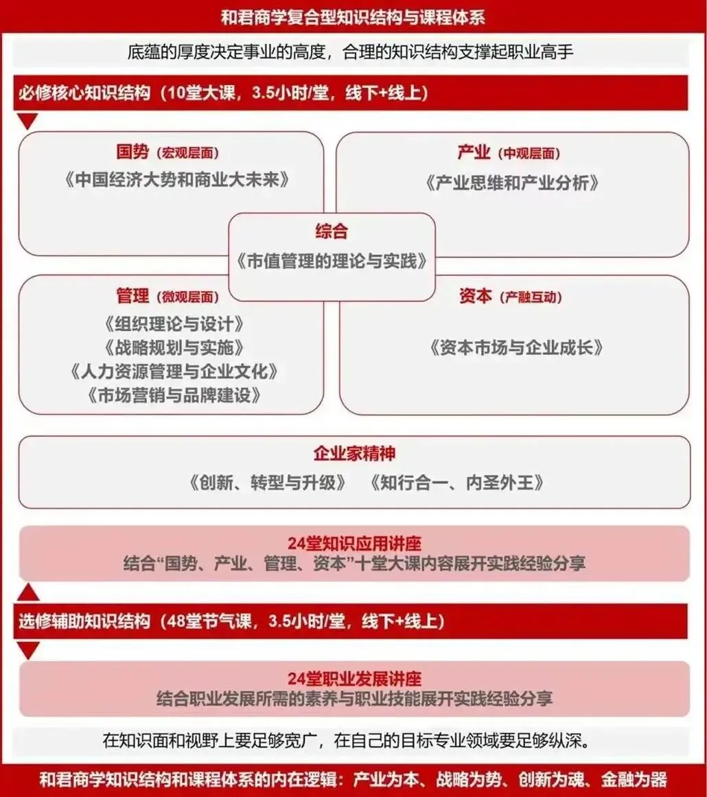 和君商学院通识课,涵盖“国势+产业+管理+资本”的系统知识体系,建设“丁”字型的复合式知识结构:在知识面和视野上要足够宽广,在自己的目标专业领域要足够纵深,打下坚实的商业底盘。
