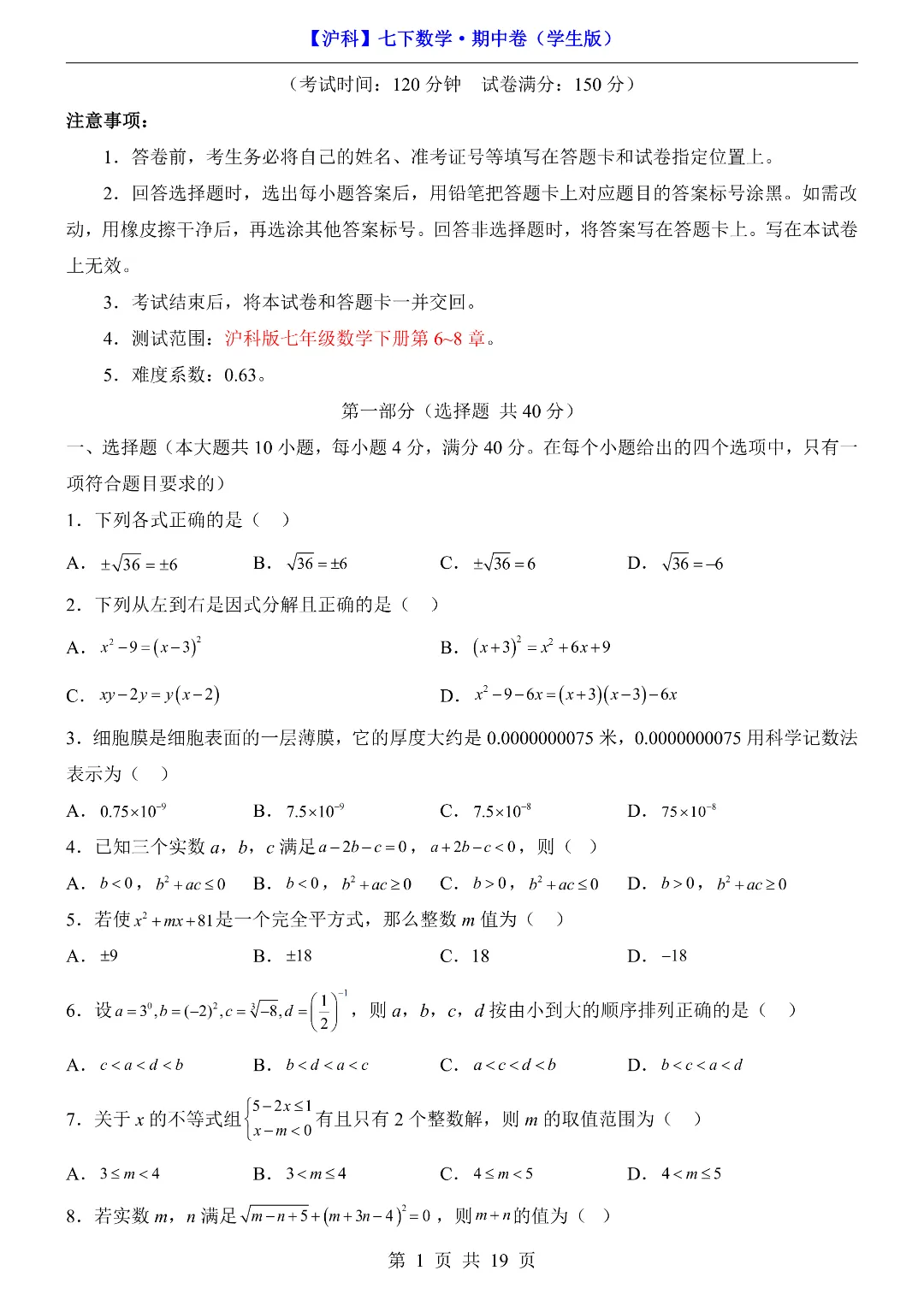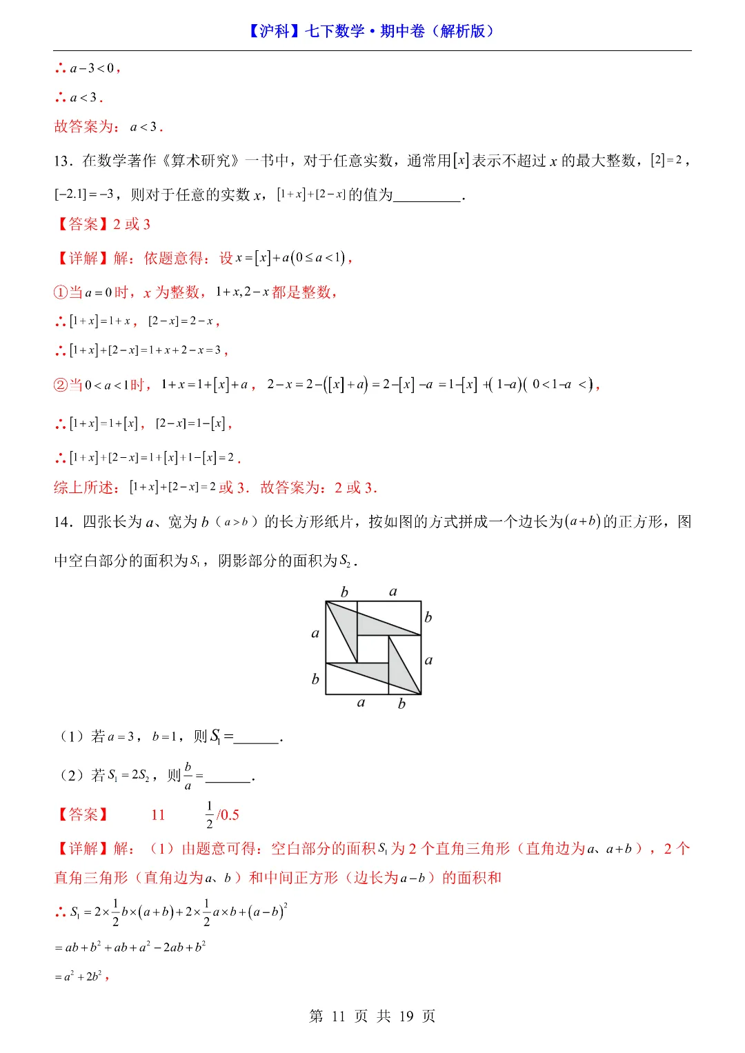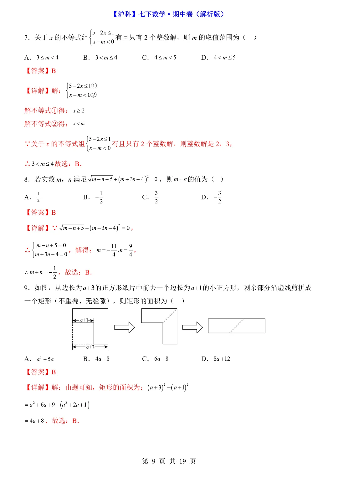 今天给家长们分享的是:26年春新七年级下册沪科版数学《期中考试测试卷》附答案解析‖高清电子版可打印