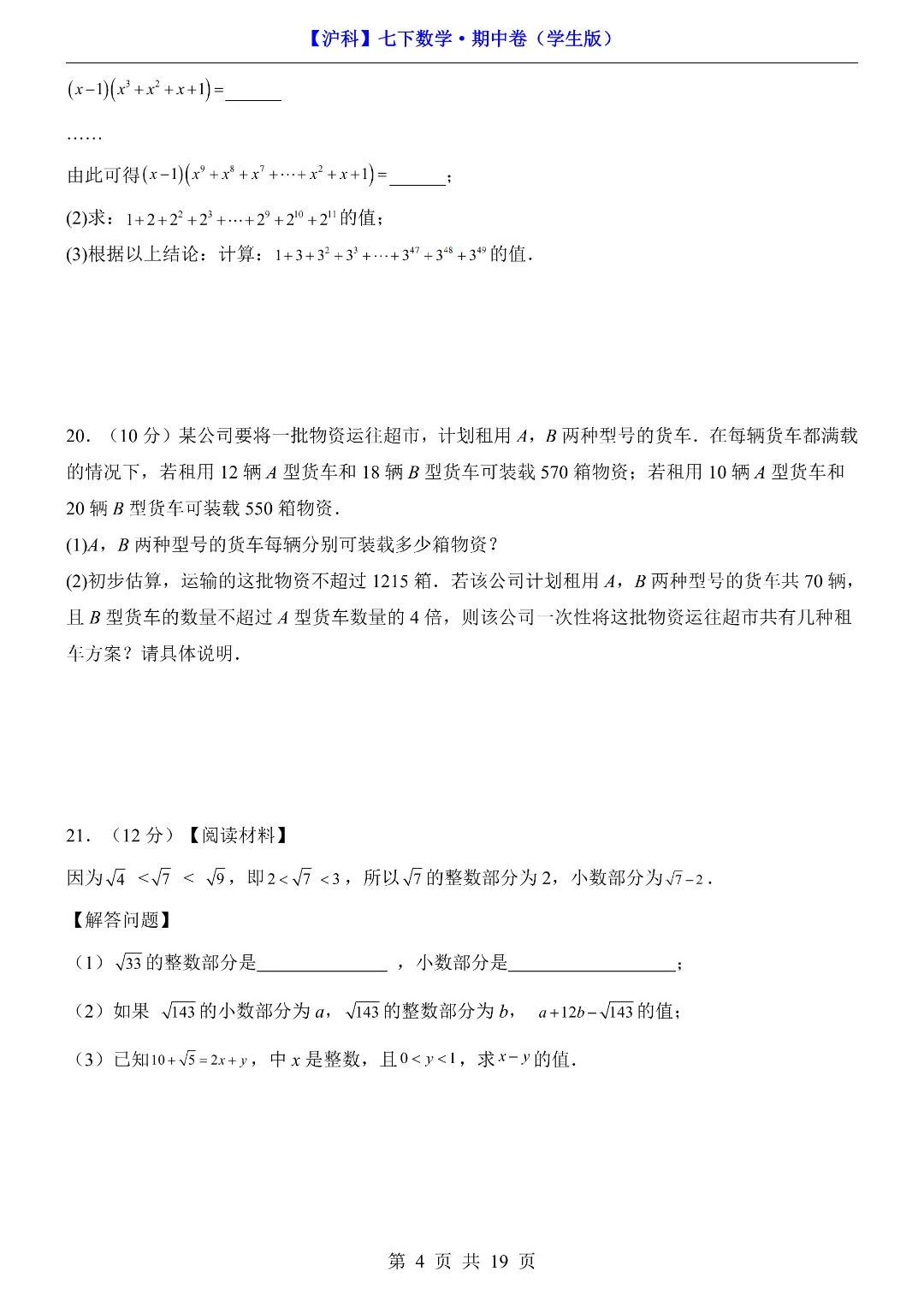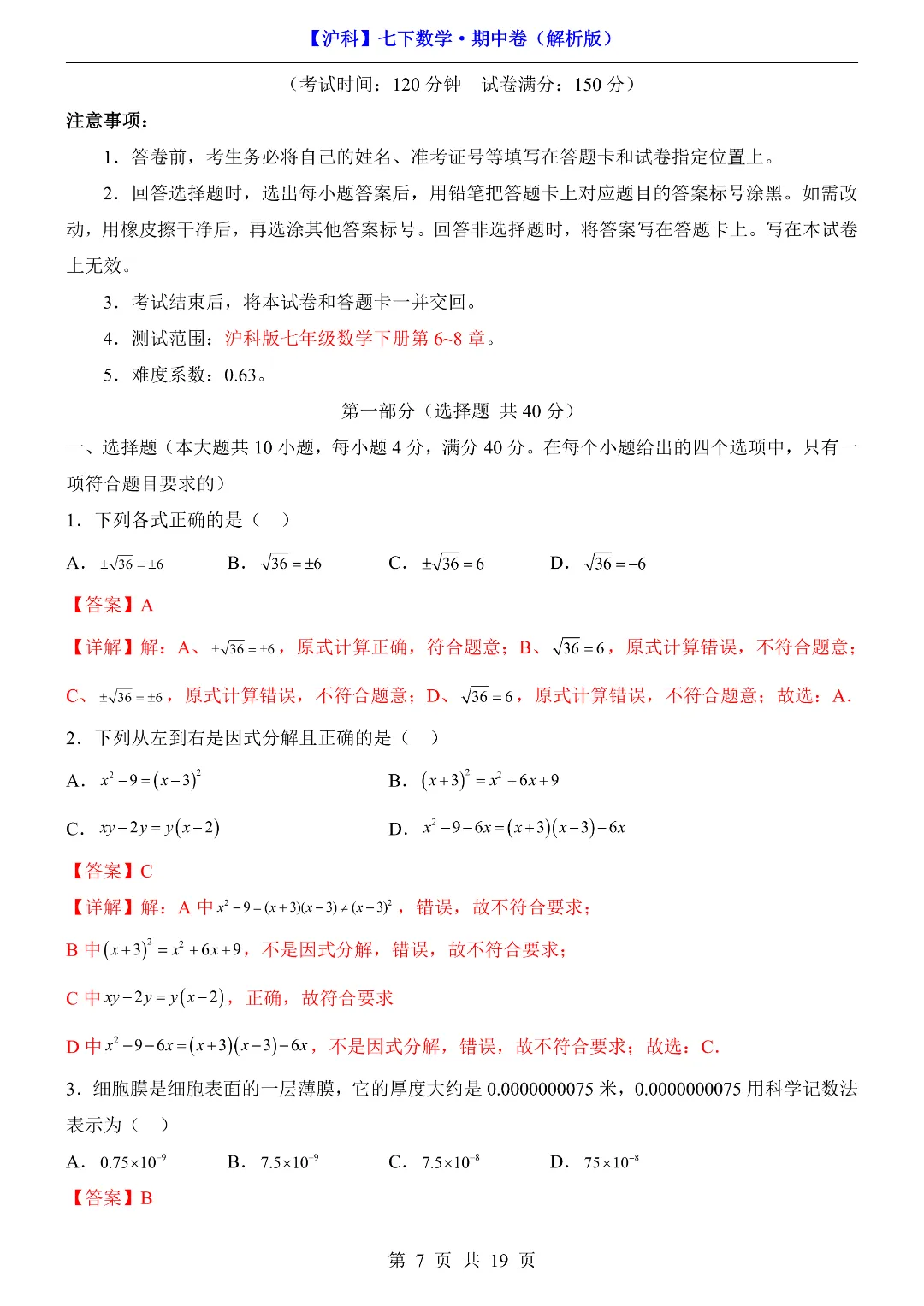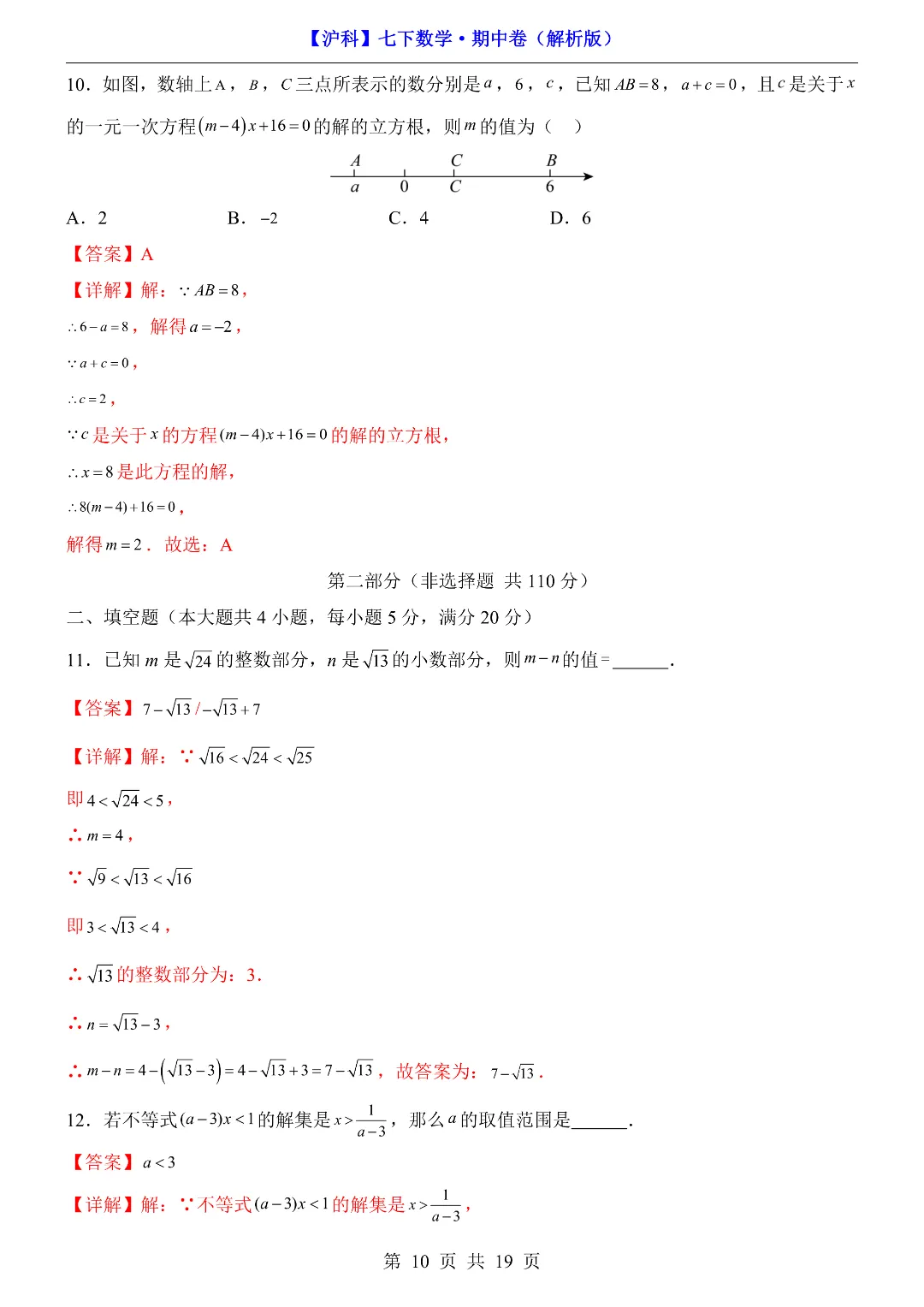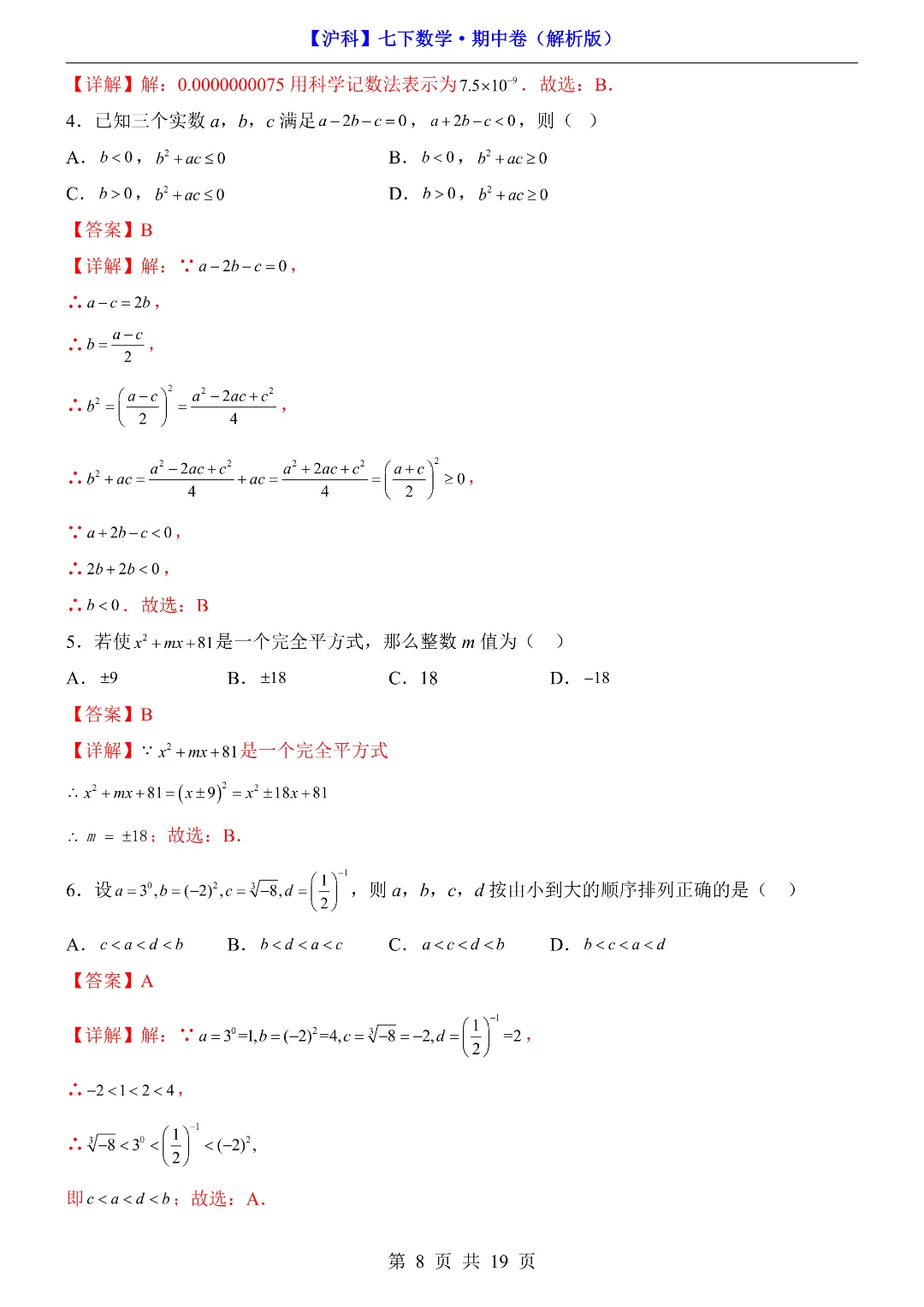 今天给家长们分享的是:26年春新七年级下册沪科版数学《期中考试测试卷》附答案解析‖高清电子版可打印