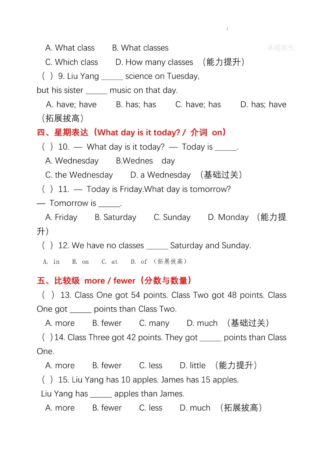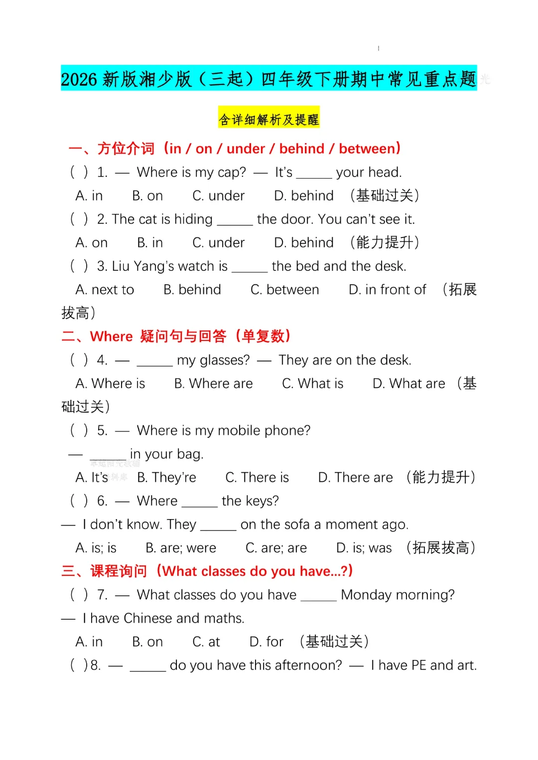 今天给大家分享的是:26春新版四年级下册英语【湘少版】【期中复习常见重点综合训练题】含答案丨完整高清电子版可打印