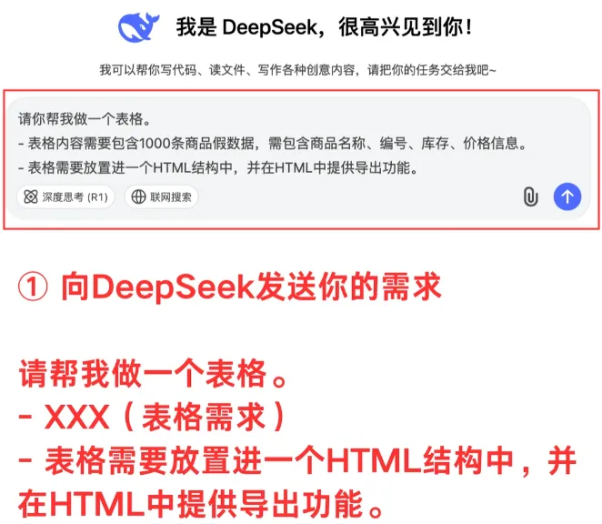 不用懂函数、不用学技巧,只要说清你的需求(比如“做一份月度销售统计表,包含日期、产品、销售额”),DeepSeek秒出完整表格,格式规整、数据无误,复制粘贴就能直接用。