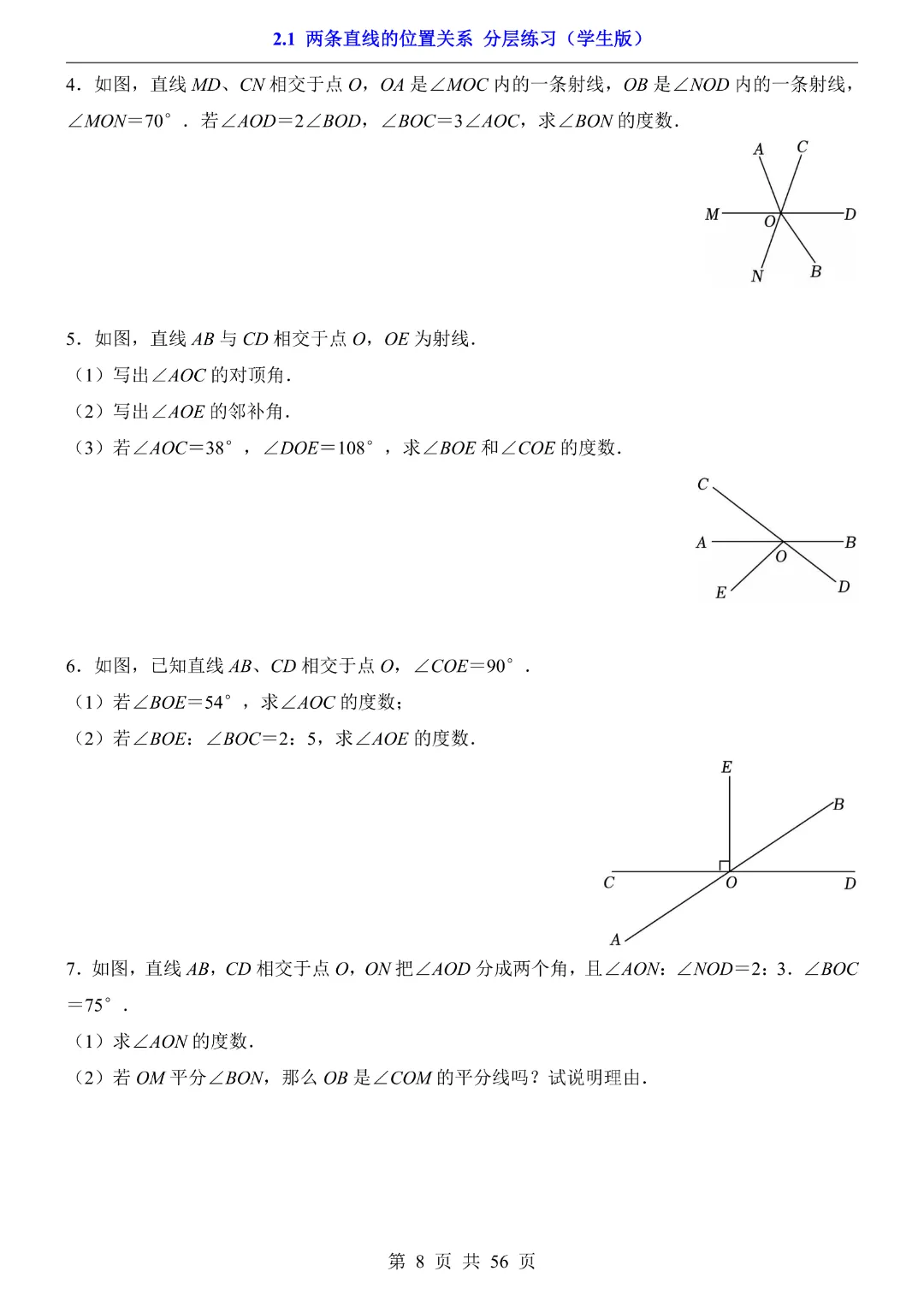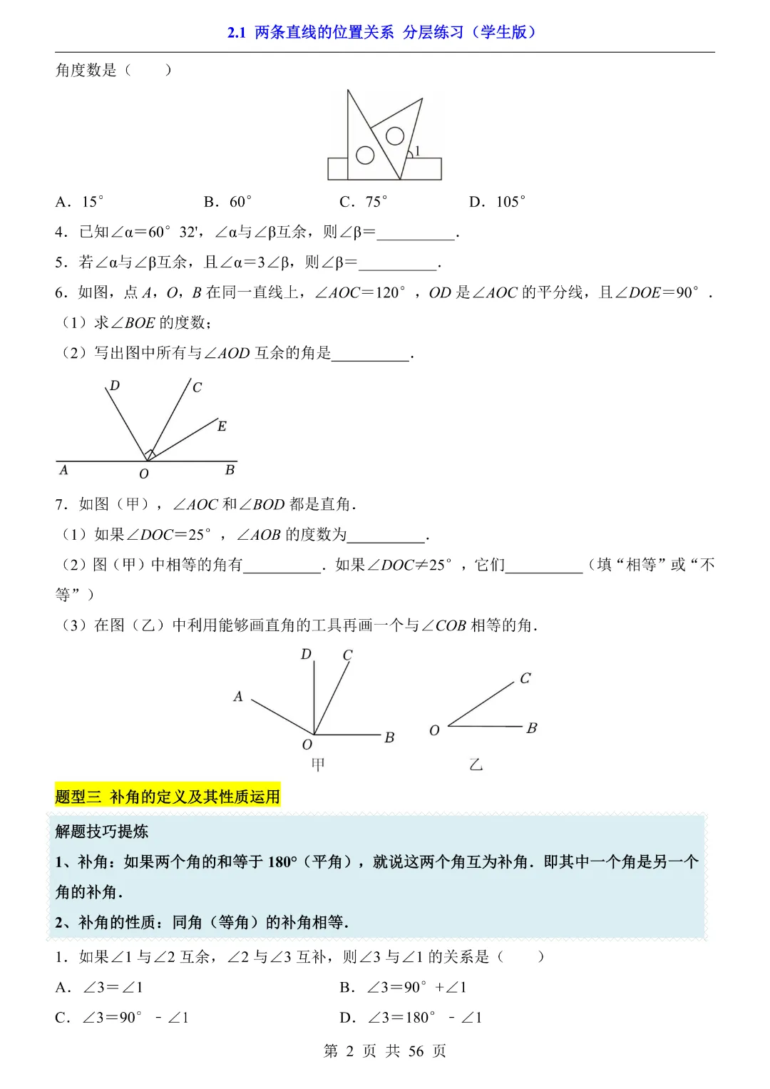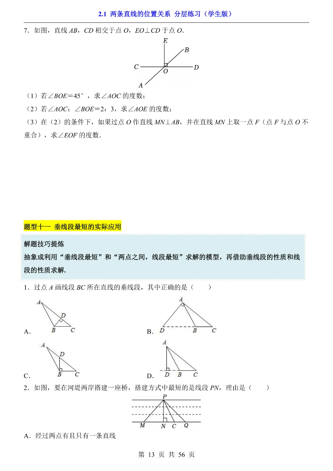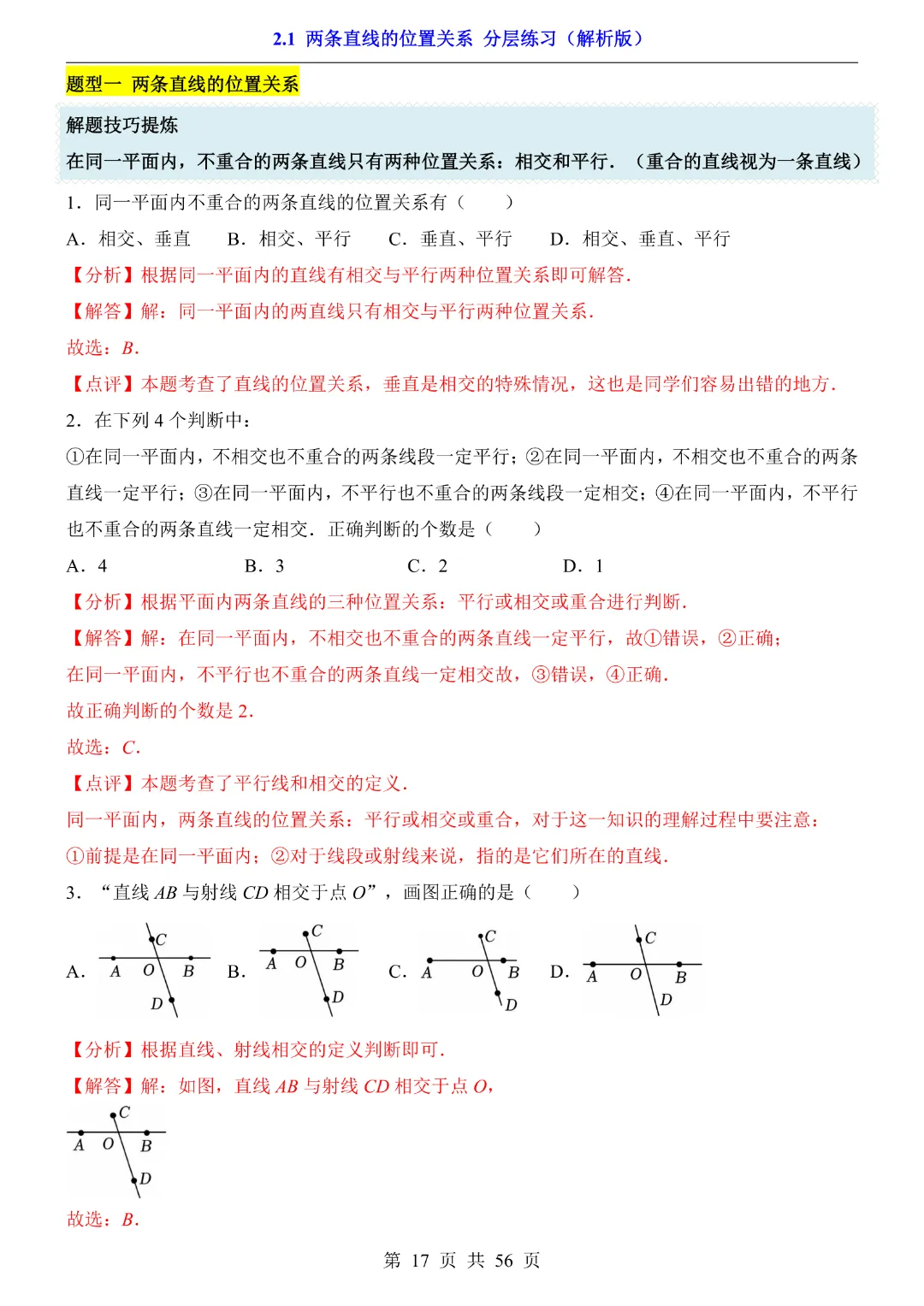 今天给大家分享的是:【七年级下册数学】【北师大版】期中考前冲刺2.1 两条直线的位置关系分层练习带答案|完整高清电子版可打印