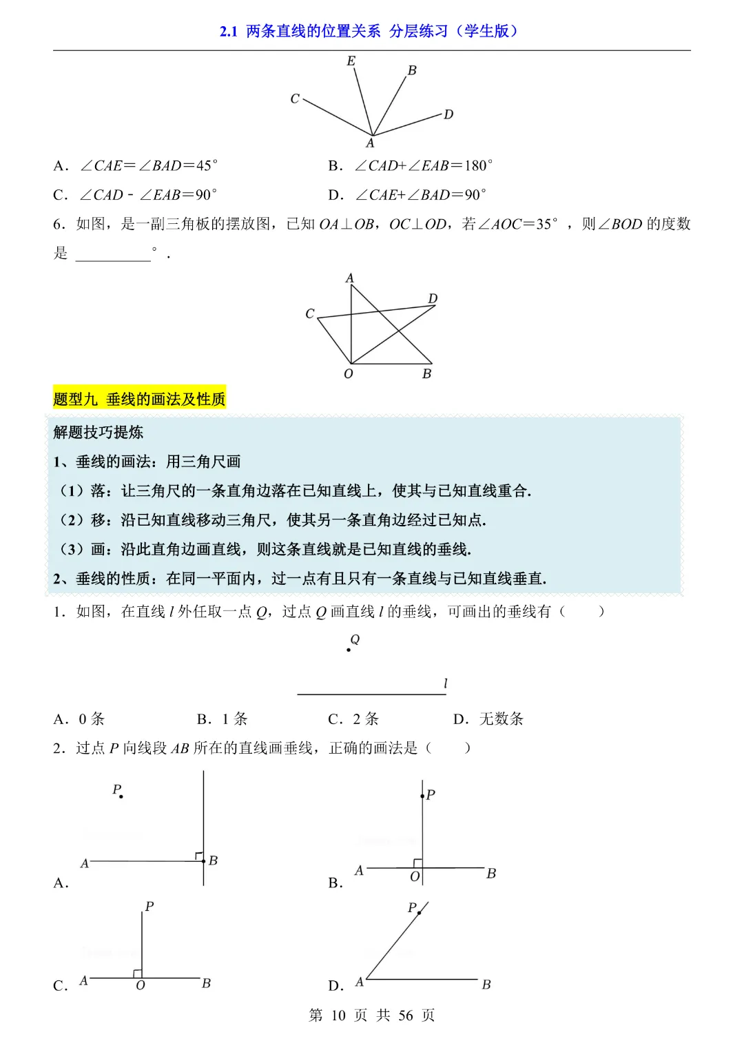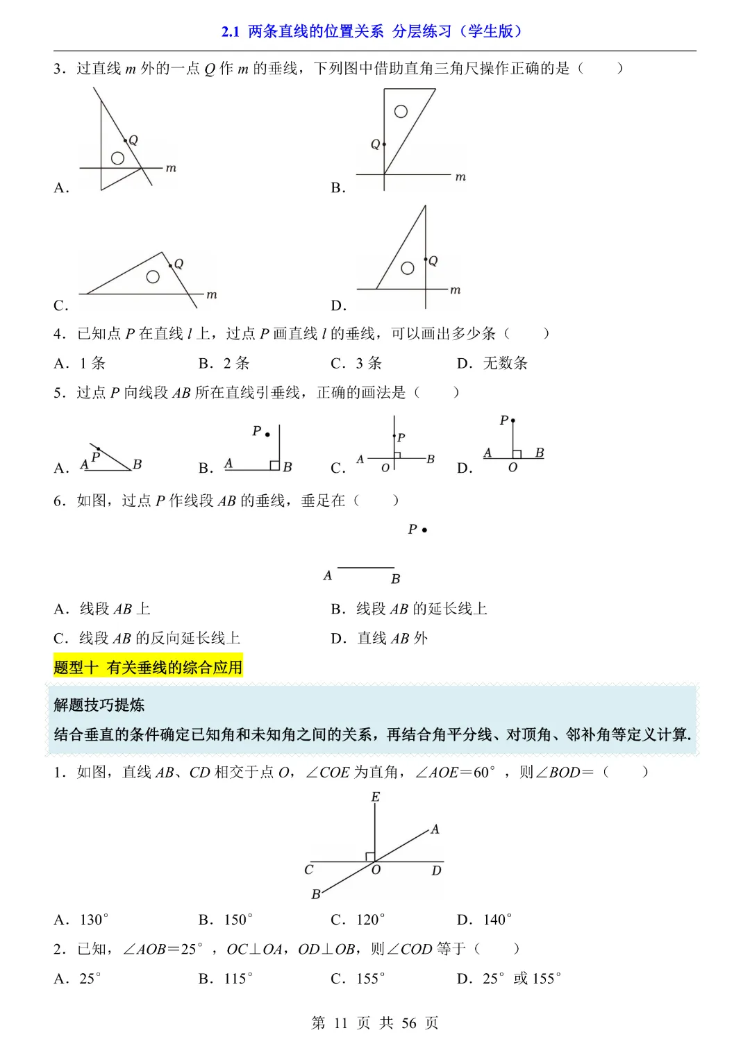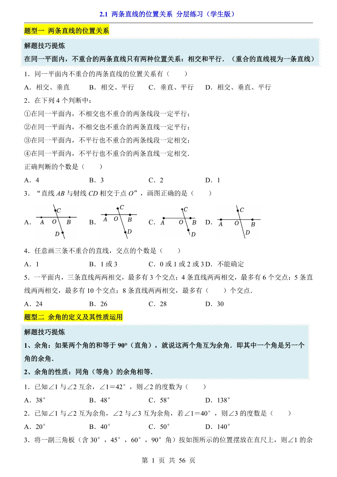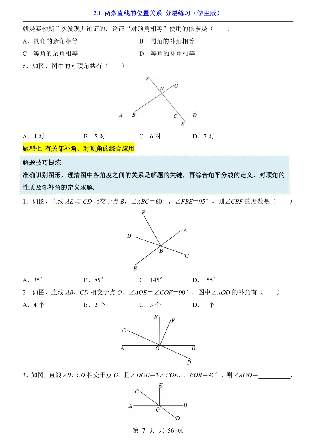 今天给大家分享的是:【七年级下册数学】【北师大版】期中考前冲刺2.1 两条直线的位置关系分层练习带答案|完整高清电子版可打印