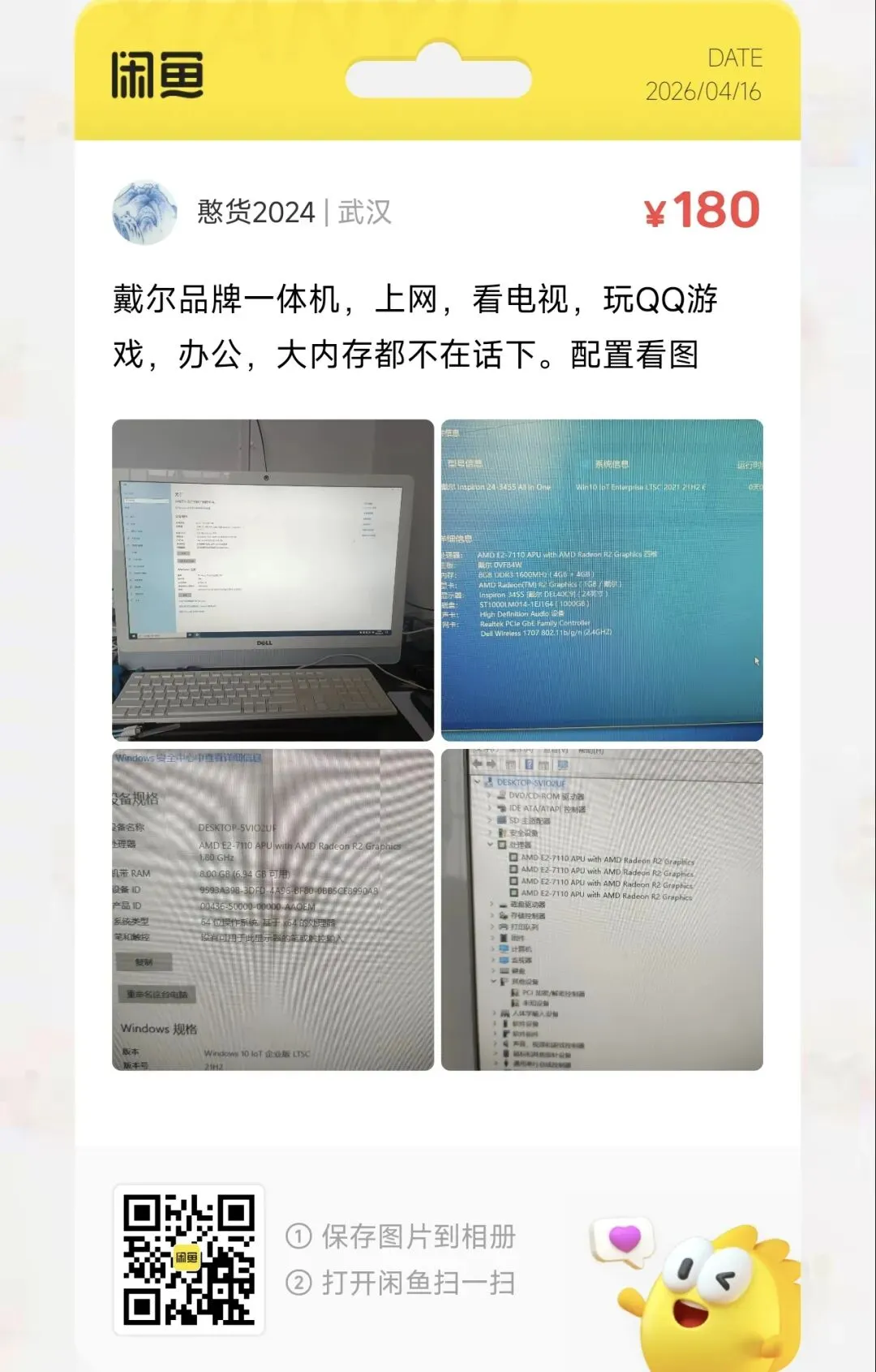 一台180元24寸戴尔品牌一体机,上网,看电视,玩QQ游戏,办公,大内存都不在话下,8+1T。炒个股还是可以的