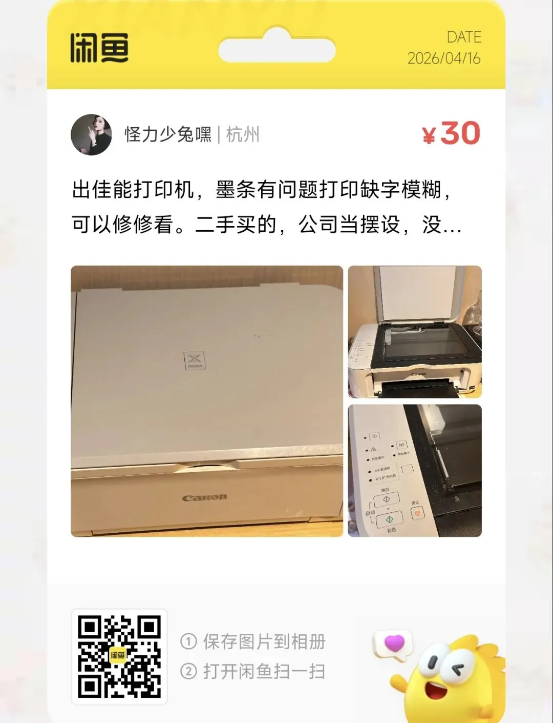 一台30元的佳能打印机,墨条有问题打印缺字模糊,懂的可以去看看。