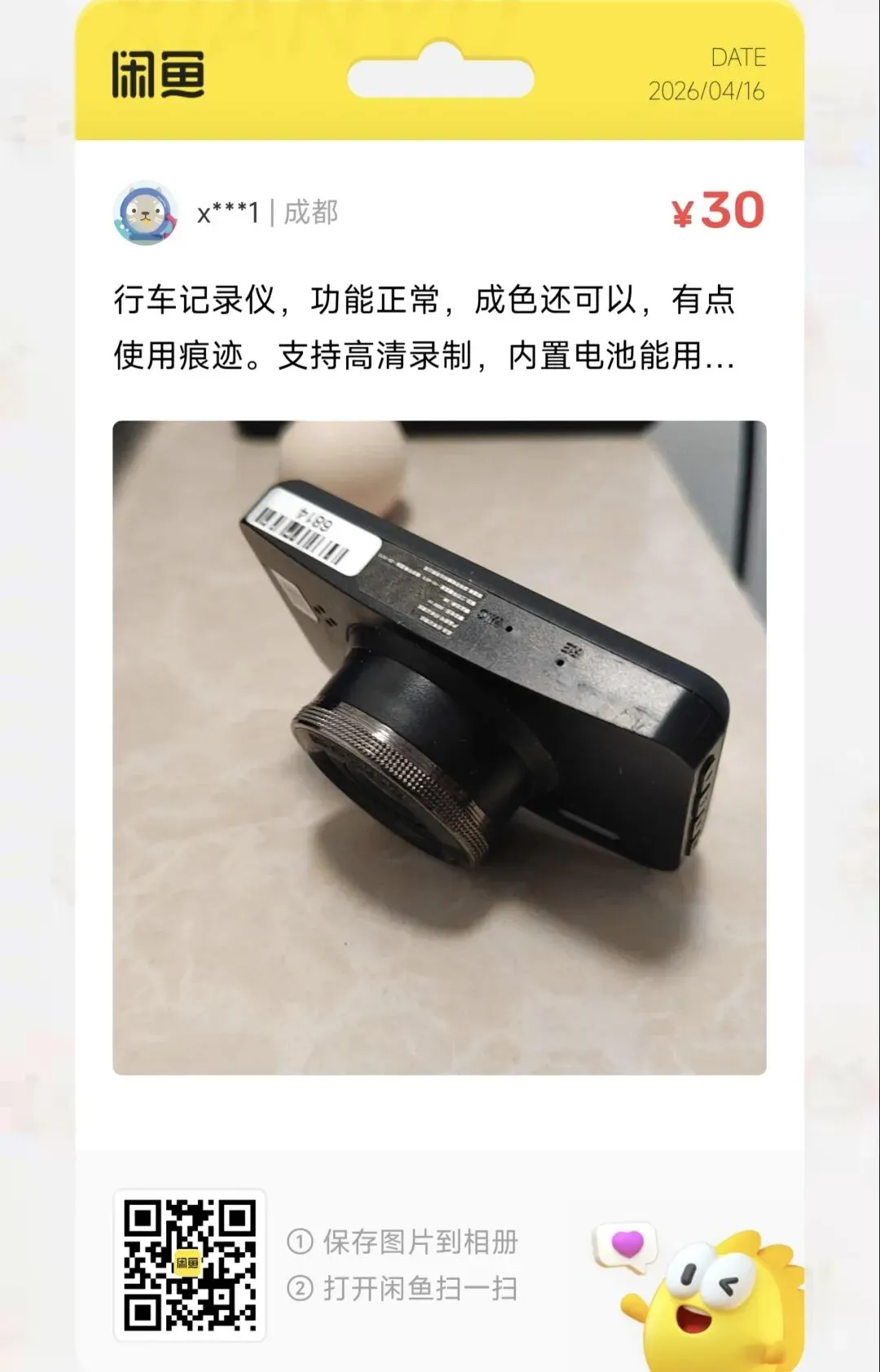 一台30元包邮的行车记录仪,功能正常,成色还可以,有点使用痕迹。支持高清录制,内置电池能用,断电后可以继续录。带32G内存卡,直接用。