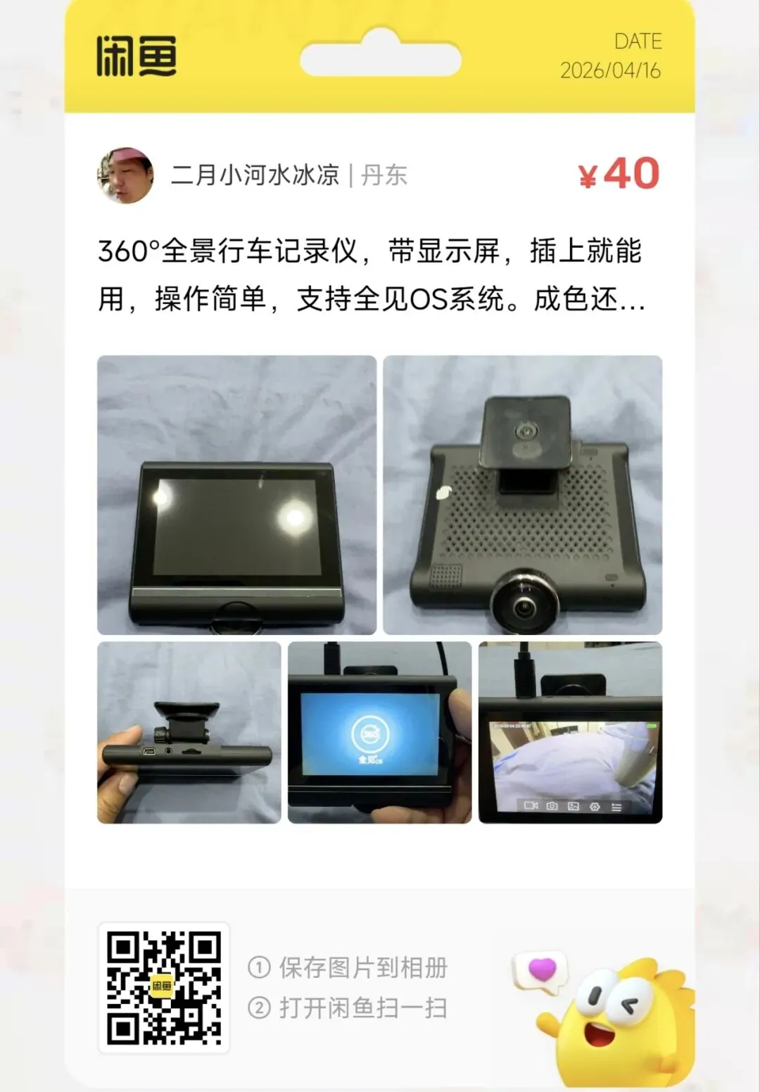 一台40元的360°全景行车记录仪,带显示屏,插上就能用,操作简单,支持全见OS系统