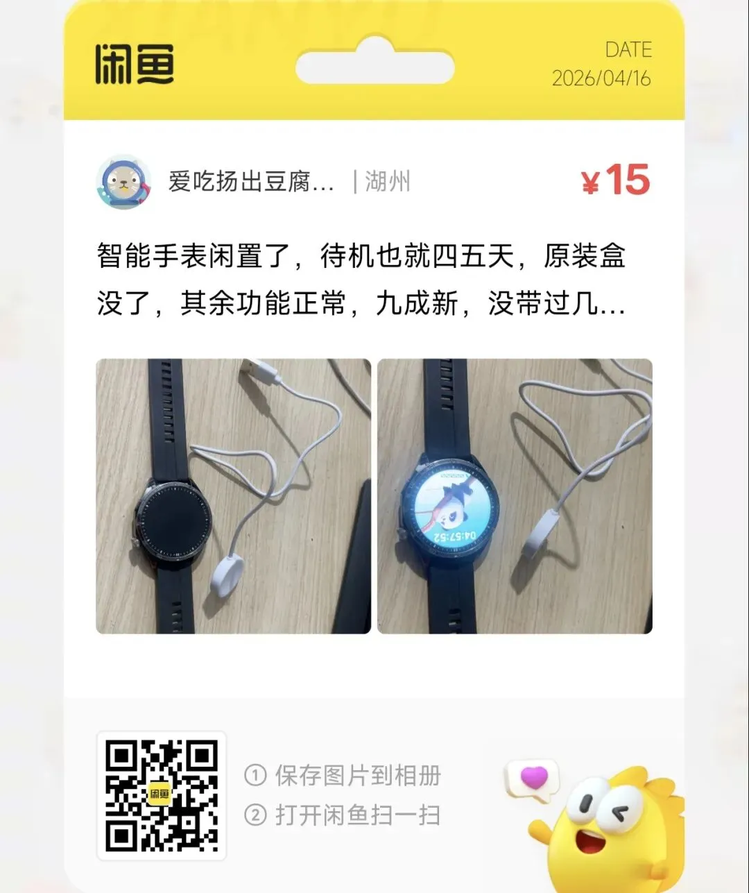 一台15元的智能手表闲置了,待机也就四五天,原装盒没了,其余功能正常,九成新